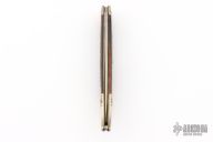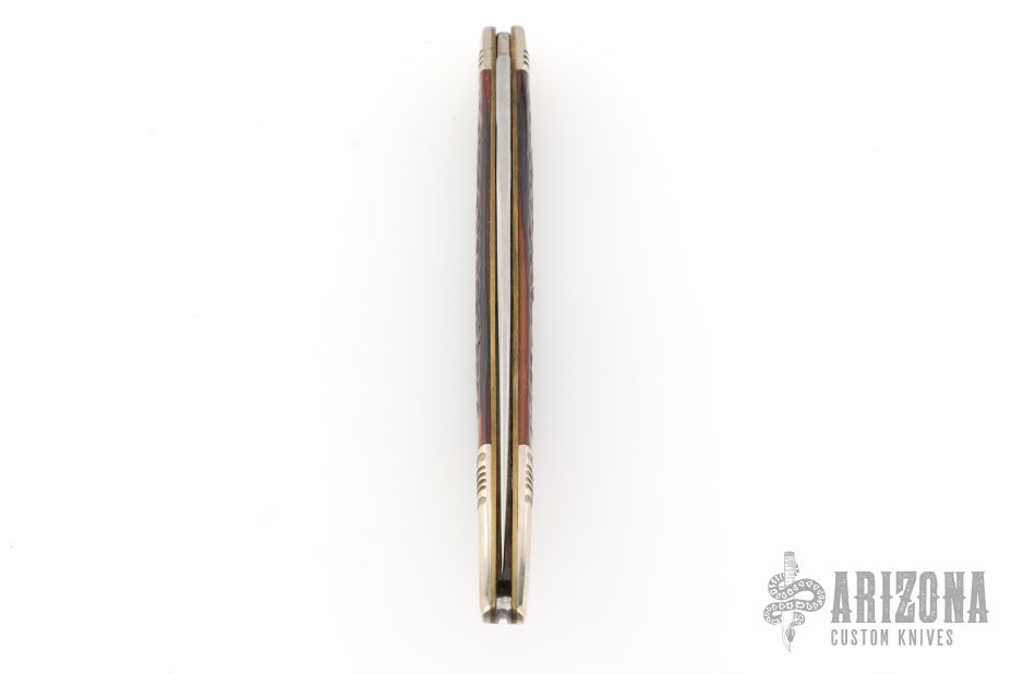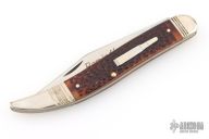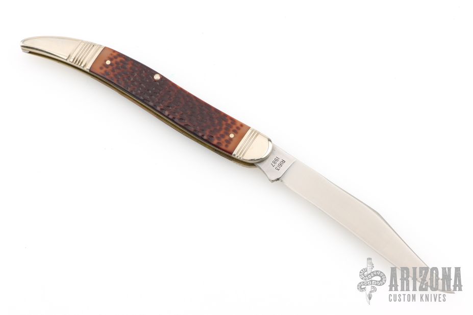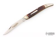 This Texas Toothpick has a satin finished blade with a nail nick. The handle has nickel silver bolsters, faux jigged bone covers and brass liners.  Stainless Steel backspring.  Includes the original box and papers. Has a light patina. Excellent Condition.