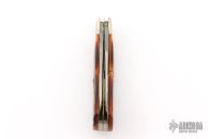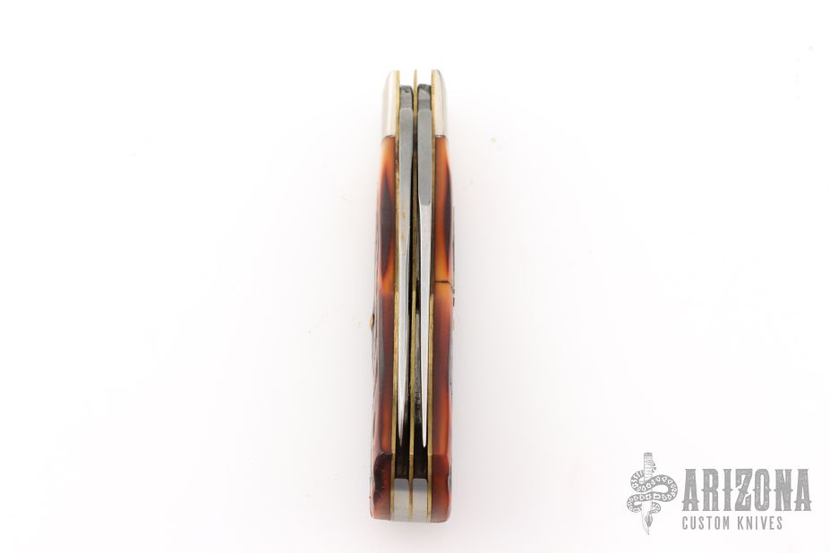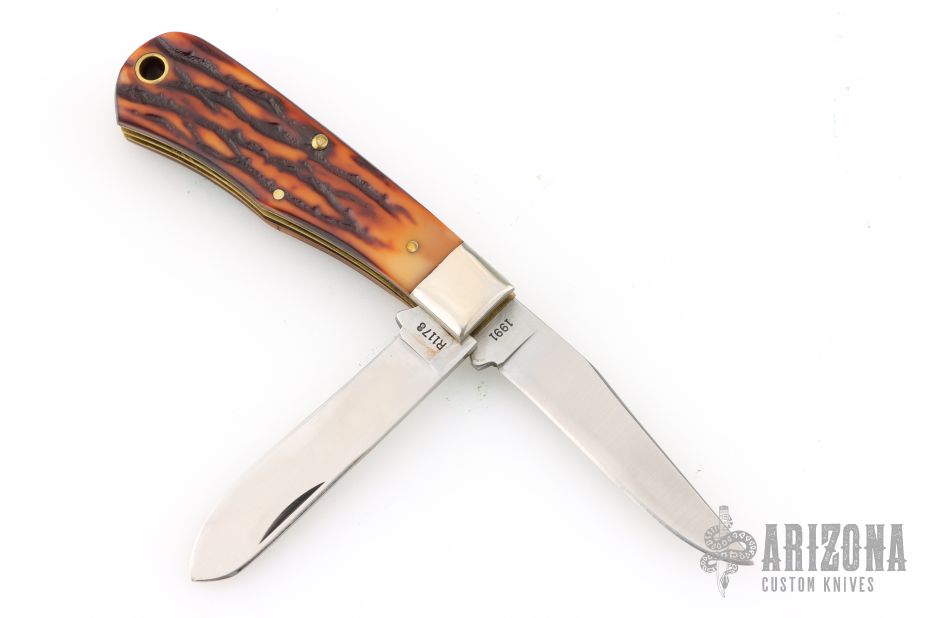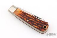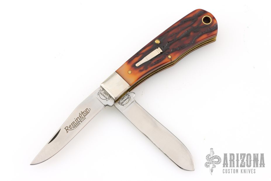 This Bullet Knife by Remmington has two satin finished blades with nail nicks. The handle has nickel silver bolsters, stag covers, brass liners and steel springs.  Includes the original box and papers. Has a light patina, Excellent Condition.