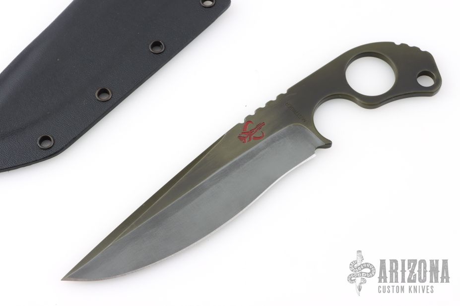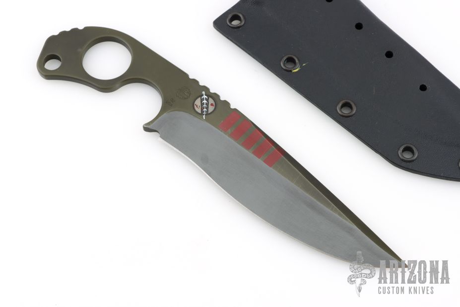 In 1988, he began making specialized knives for use by the military. This turned out to be fortunate turn of events, both for Mick and for the knife using world at large. Mick’s approach was to not get burdened by the weight of past designs. He started with a tabula rasa, a clean slate, informed only by his own experiences and knowledge of what a soldier needed in a knife. The knives he made didn’t look like the hunter-inspired knives seen in most PXs; instead they were almost brutish in their functionality: beefy, solid, and with unbreakable ¼” stock full tangs. These knives were the first indication of his innovative approach: in addition to their utilitarian design, the knives carried a subdued finish and subdued sheaths. No one carrying a Strider knife was going to be spotted because of sunlight glinting off of polished steel or a glossy leather sheath. Soldiers, policemen, and other men going into harm’s way couldn’t buy them fast enough. Mick sampled some good ideas, but made them great. For instance, he was not the first to wrap a knife handle with paracord, but he was the first to do it in a way that was tough enough for sustained infantry use. His knife line grew over the following years to include different varieties of fixed blades, all distinctive and many with specialized uses. But constant in all of them was a disregard for convention, and a desire to try new ideas. An example of this was the Ajax – it featured a very wide blade surface clearly designed to inflict damage. It drew on the weapons carried by Roman legionnaires, yet was modern and usable in the 21stCentury battlefield. Mick also worked on his technical skills, always striving to become better at the physical craft. At the 2002 Blade Show, a group of the best tactical knifemakers in the country decided to compete with each other to produce the most innovative and interesting fixed “battle blade” at the show. Mick’s entry, an incredible integral knife made out of ½” titanium stock with a zippered composite blade, gorgeous handles, and integral guard was the unanimous winner, and effectively retired the competition.
