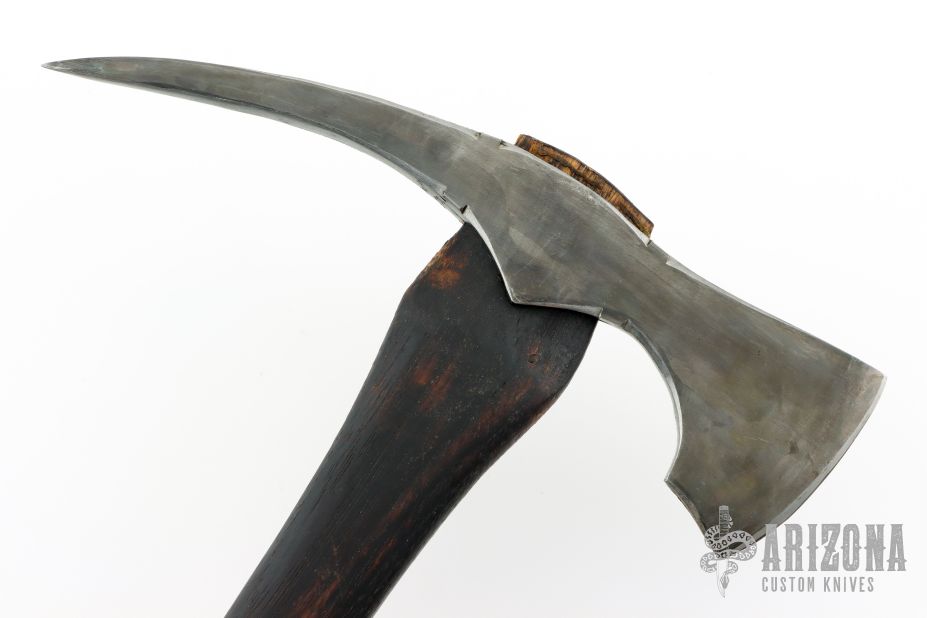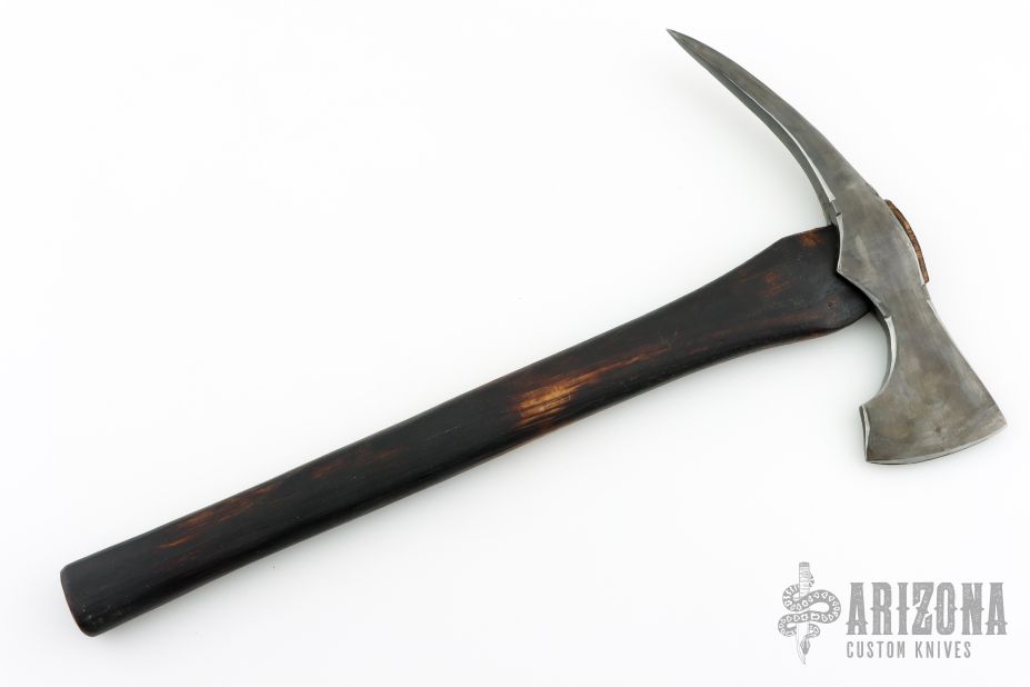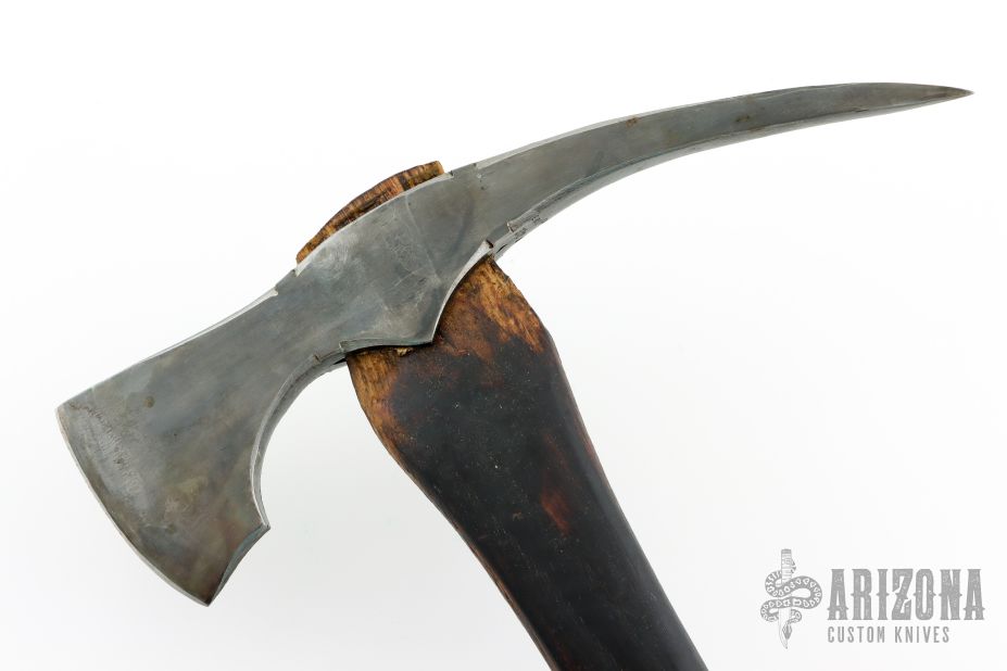 This tomahawk features a hand forged head with a 4.5" spike at the rear. Has a 15" burnt hickory shaft. Has some scuffs and patina, otherwise good condition.