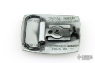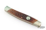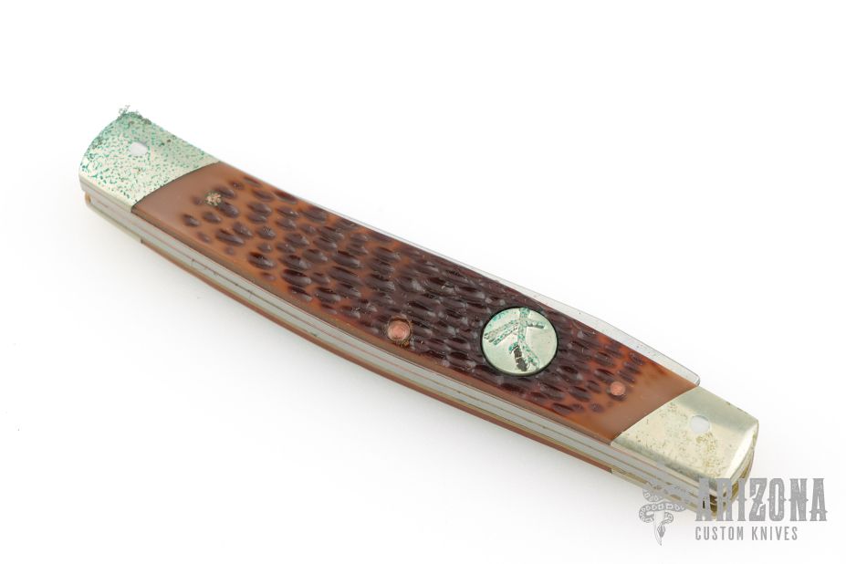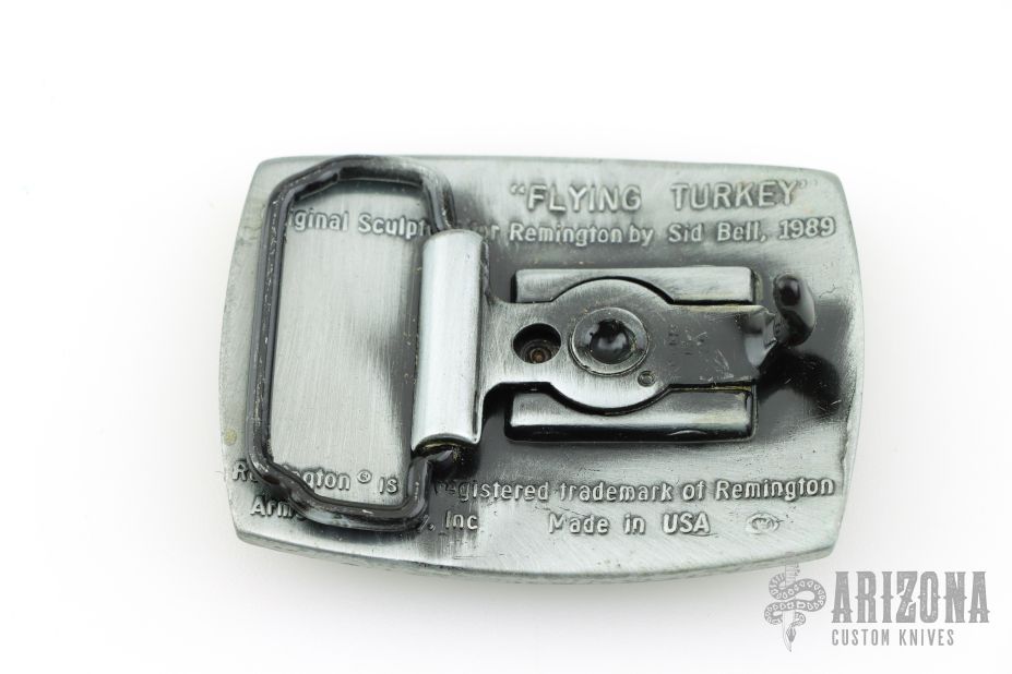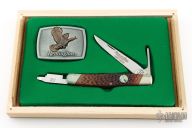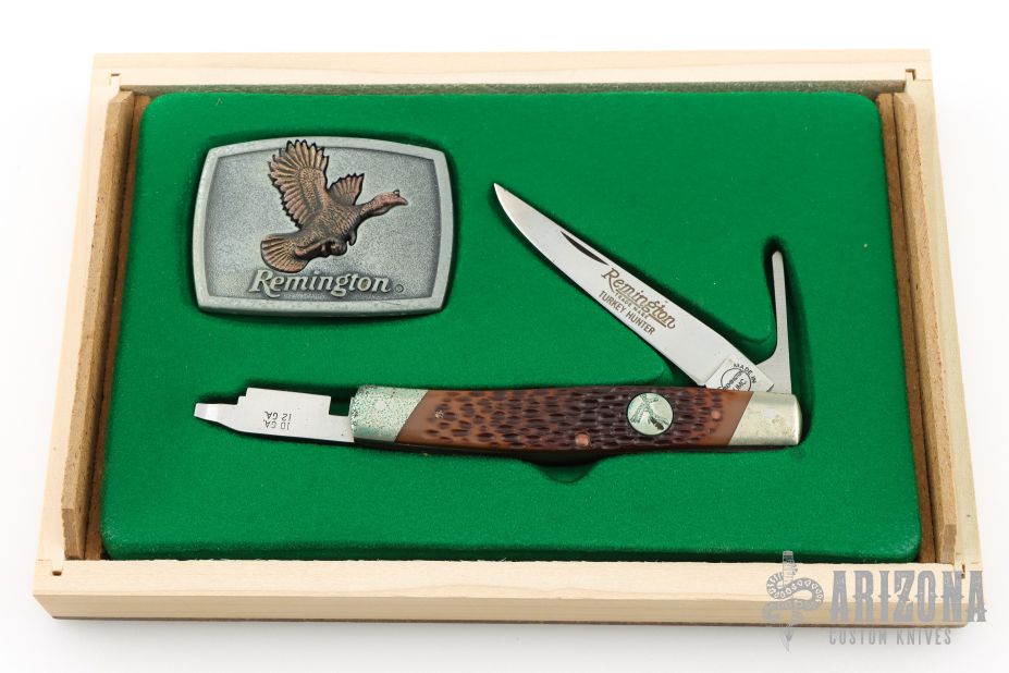 This knife by Remington features 3 satin finished blades with a single nail nick.  The handle has nickel silver front/rear bolsters, faux jigged bone covers, stainless steel backsprings. Comes in original wooden display box, with Remington flying turkey belt buckle. Has a light patina, otherwise Excellent condition. The box set was sealed in plastic (new) prior to being written up.