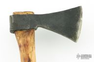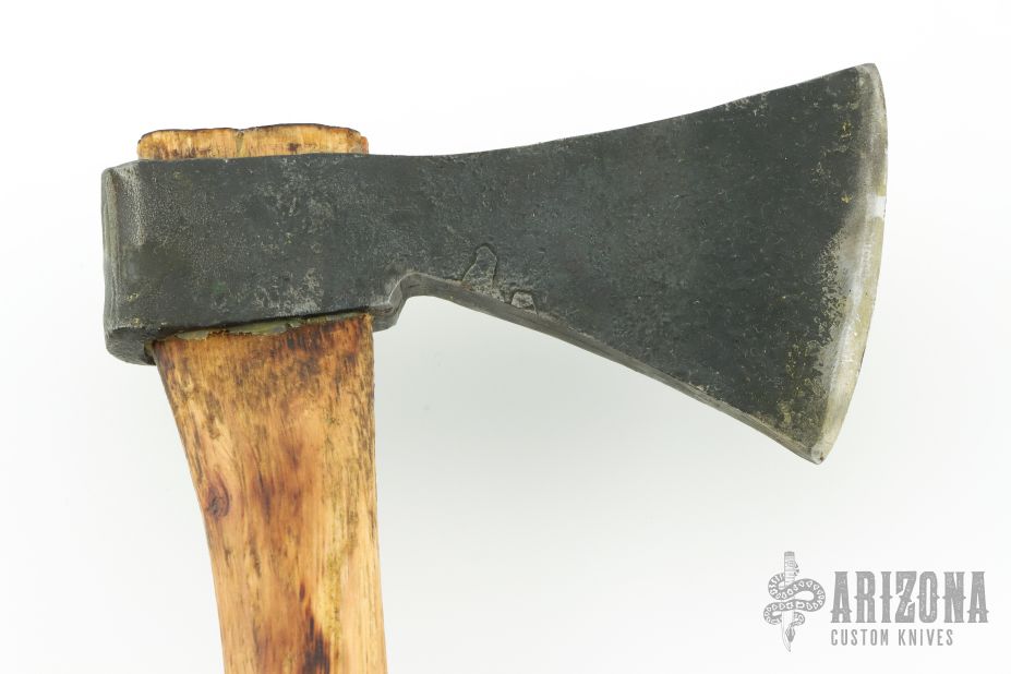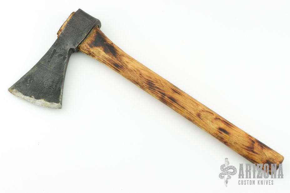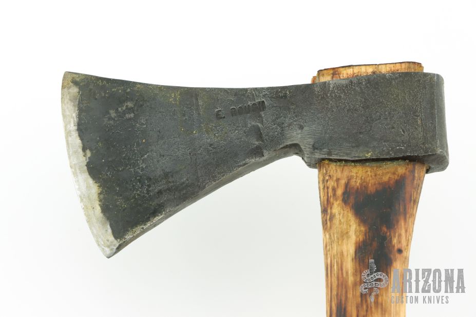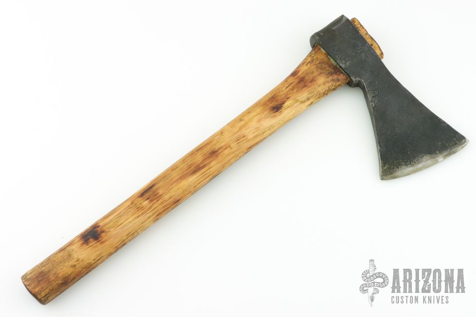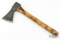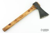 This camp axe features a hand forged head with a 3.5" blade. Has a 15" burnt hickory shaft. Has some oxidation on the edge, otherwise excellent condition.