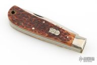This 2-Blade Jumbo Trapper by Case Knives features satin finished blades with nail nicks. The handle has nickel silver bolsters, jigged bone covers, nickel silver escutcheon, brass liners and steel springs. Has half-stops. Dated 1986, #5635. Has a light patina. Comes in original wood display box. Excellent condition.