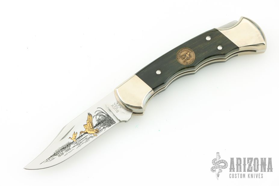 Ducks Unlimited 50th Anniversary commemorative Buck model 112. Beautiful etched blade with Ducks Unlimited medallion inlay in wood handle. Nickel silver caps and liners. Has some patina, otherwise excellent condition. Includes the original display box and papers.