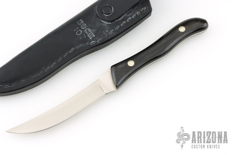 This Scout from Buck Knives features satin finish blade, .079" Blade Stock .599" Blade Depth. The handle is comprised of wood scales over full tang construction. Comes with original box, papers, and black leather sheath. Excellent condition.