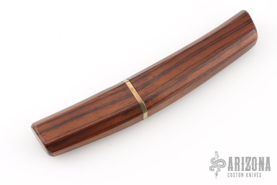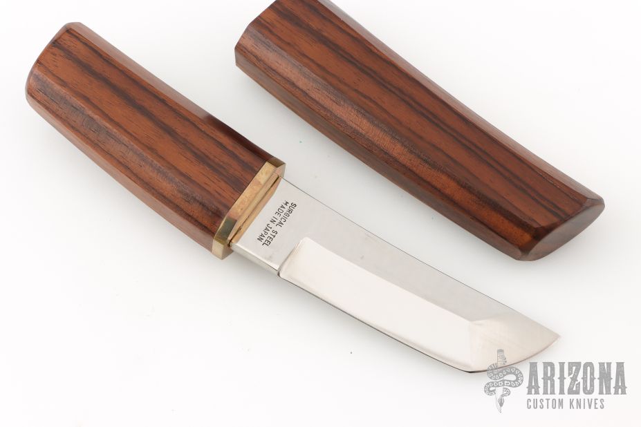 This knife by Parker Cutlery Company features a mirror polished blade with .196" blade stock and 1.083" blade depth, hidden tang construction. The handle has a brass guard and a wood grip. Has a matching wooden saya. Comes with original box. Excellent condition.