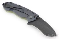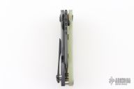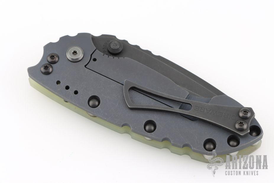 This Solo framelock features a jade G-10 and tumbled titanium frame with and tip up clip. Black finished blade with a thickness of .178", notched thumbrest and dual thumbstuds. Smooth function with a strong lock up, nice detent and blade seating is dead center. Includes a padded case.  Has a few light scratches, otherwise excellent condition.