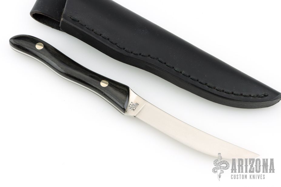 This Scout from Buck Knives features satin finish blade, .079" Blade Stock .574" Blade Depth. The handle is comprised of wood scales over full tang construction. Comes with original box, papers, and black leather sheath. Excellent condition.