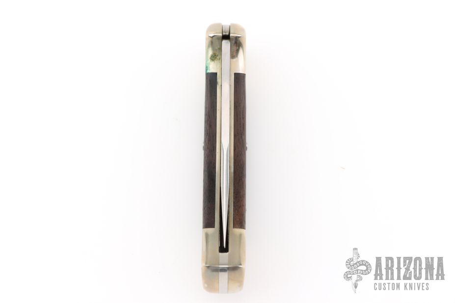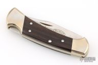 This Model 112 by Buck features a satin finished and etched blade with nail nick. The handle has a nickel silver frame with wood scales. Comes with original box, papers, and black leather sheath. Has a couple light scuffs, and a patina. Excellent condition.