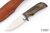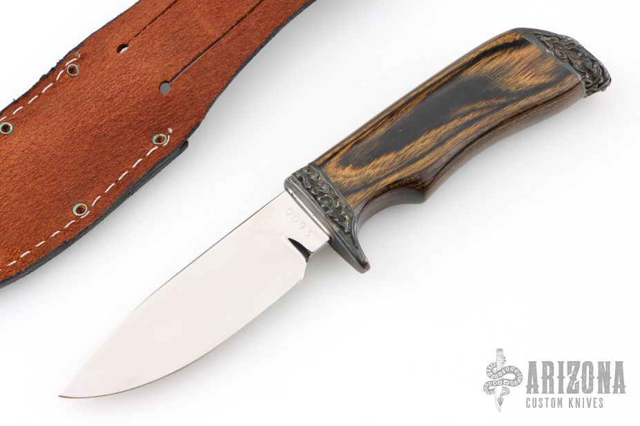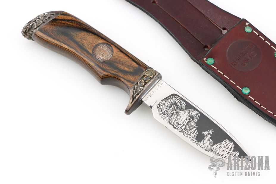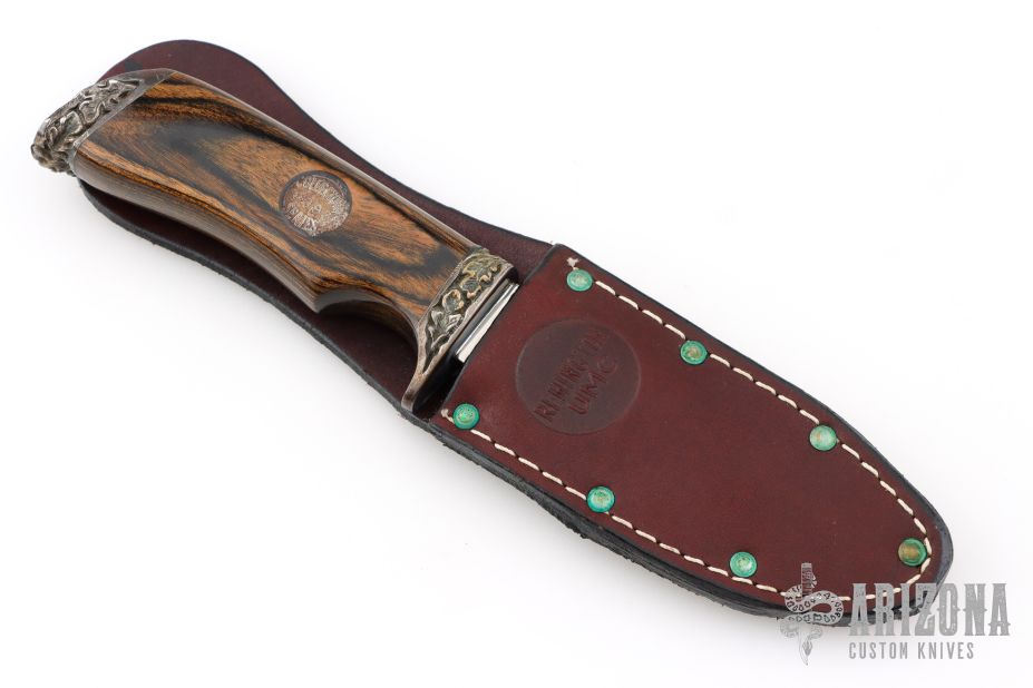 This Collectors Series Limited Edition knife by Smith and Wesson has the serial number of 0093. The blade features a polished and etched graphic. .245" Blade Stock. 1.033" Blade Depth. The handle is comprised of a sterling silver guard and pommel with dymondwood handle over hidden tang construction. Sterling Silver inlay marked "Collectors Series 0093" on "B" side of handle. Includes a brown leather sheath. Has some patina on the silver, otherwise excellent condition.