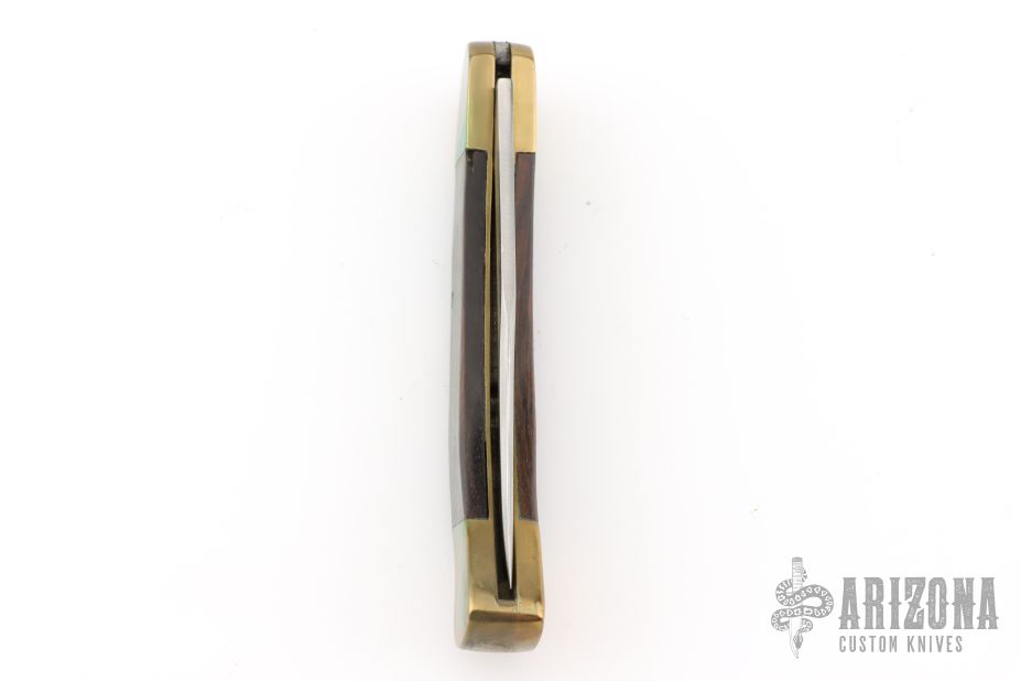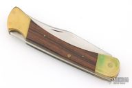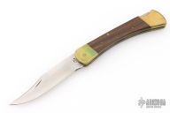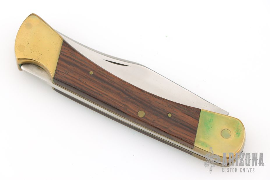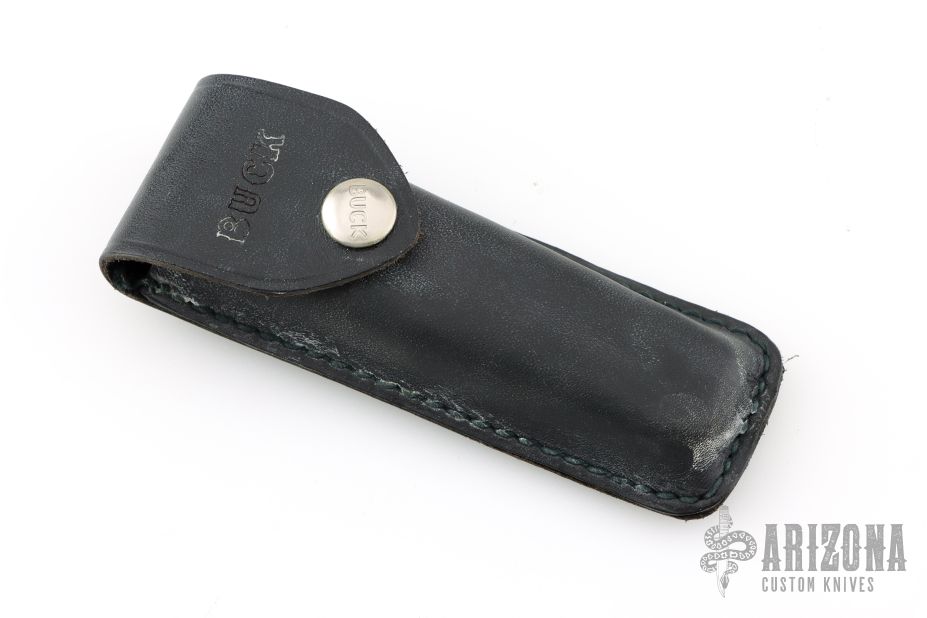This vintage Buck 110 "folding hunter" features a satin finished clip point blade with nail nick. It has wood scales, brass bolsters and frame. Comes with original box, papers, and leather sheath. Has some scratches, and patina. Great condition otherwise.