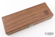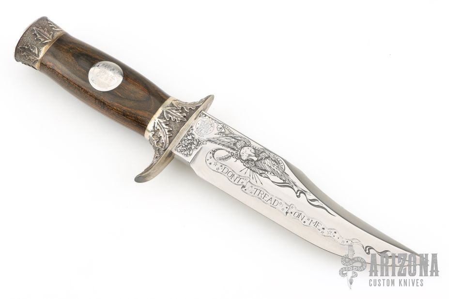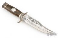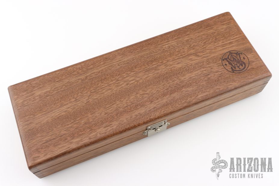 This Collectors Series Limited Edition knife by Smith and Wesson has the serial number of 0093. The blade features a polished and etched graphic. .245" Blade Stock. 1.033" Blade Depth. The handle is comprised of a sterling silver guard and pommel with dymondwood handle over hidden tang construction. Sterling Silver inlay marked "Collectors Series 0093" on "B" side of handle. Includes the original box. Has a few light scratches, otherwise excellent condition.
