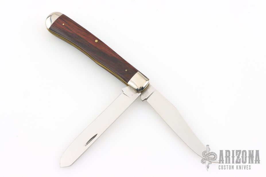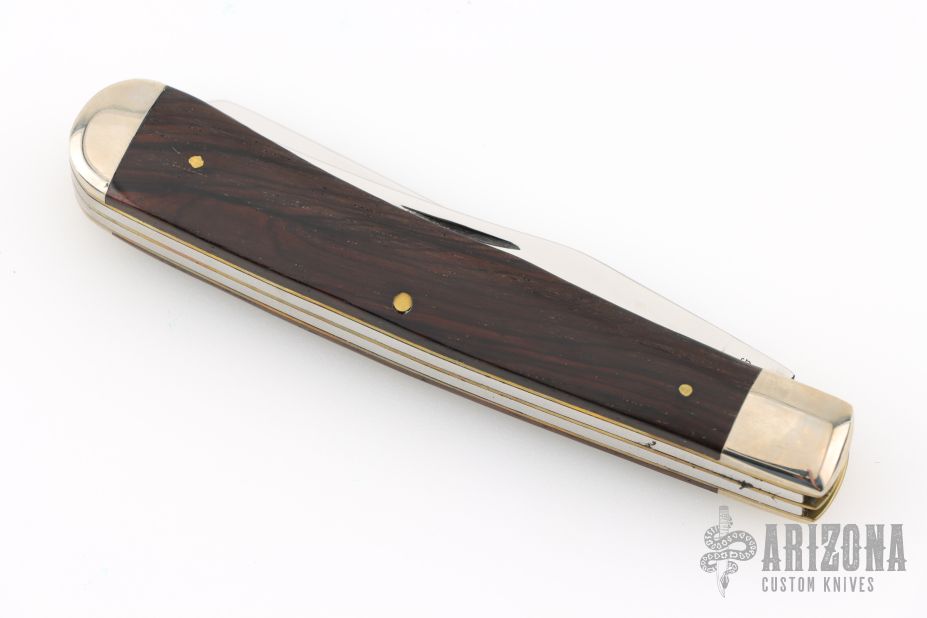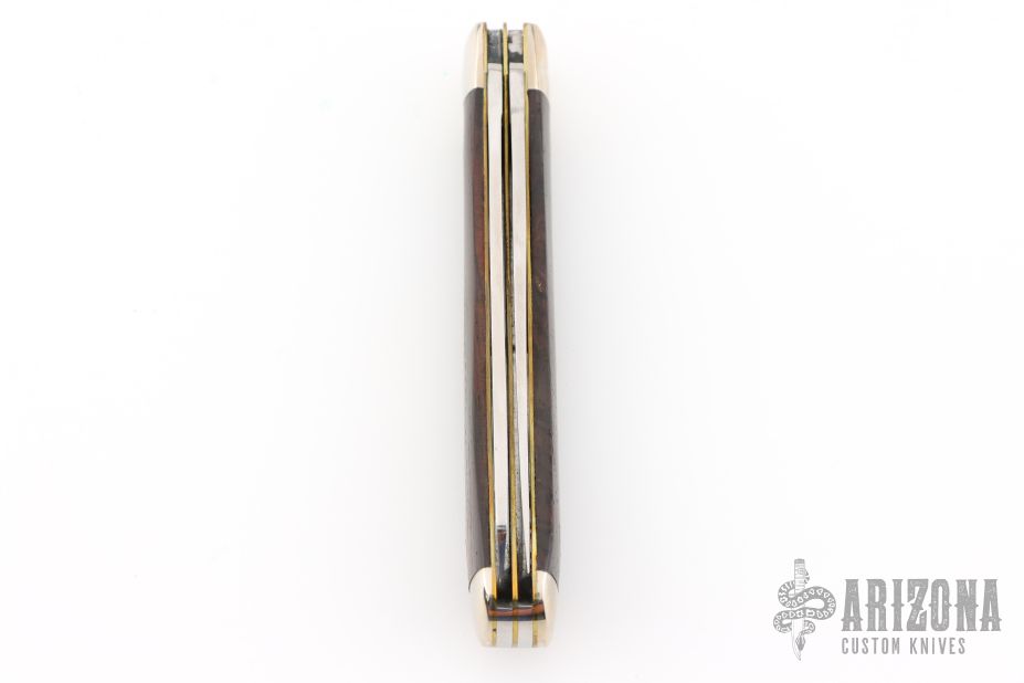 This slipjoint by Browning features polished blades with nail nicks. The handle is comprised of nickel silver double bolsters and liners, rosewood scales, and stainless steel backspacers. Includes original box and papers. Has some light scratches, otherwise excellent condition.