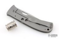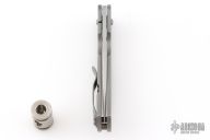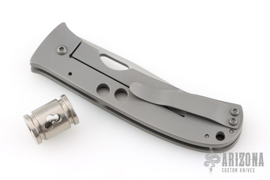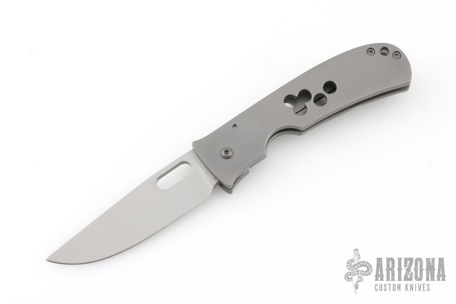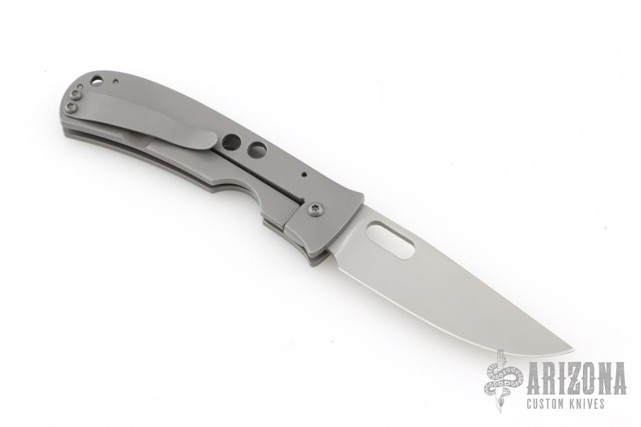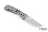 This framelock folder by Tom Mayo features a Stellite 6K blade with a fine bead blast finish and thumbhole opening. The handle has a bead blast titanium frame with titanium clip, tip up carry. Smooth action. Flat scales. Nice blade seating, detent, and lockup. Includes a bead. Comes with a velcro case. Excellent condition.