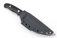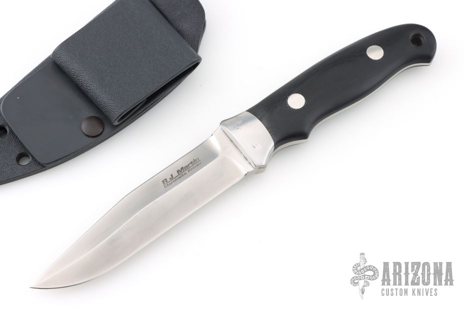 This New York Special by RJ Martin features a bead blast finished double-edged blade with .162" blade stock and 1.038" blade depth, full tapered tang construction. The handle has stainless steel dovetail bolsters, and black canvas micarta scales. Comes with a kydex belt sheath.