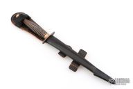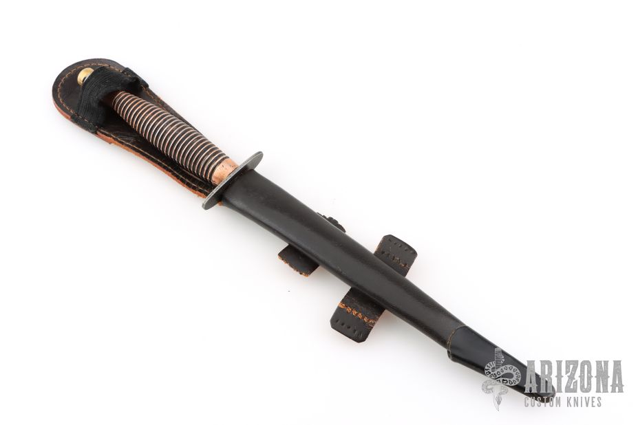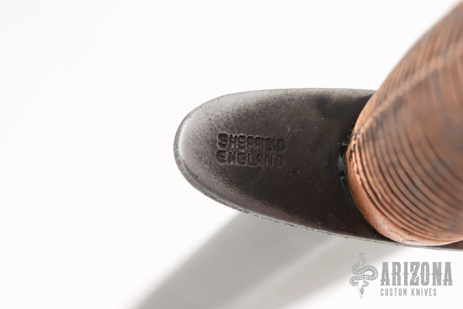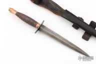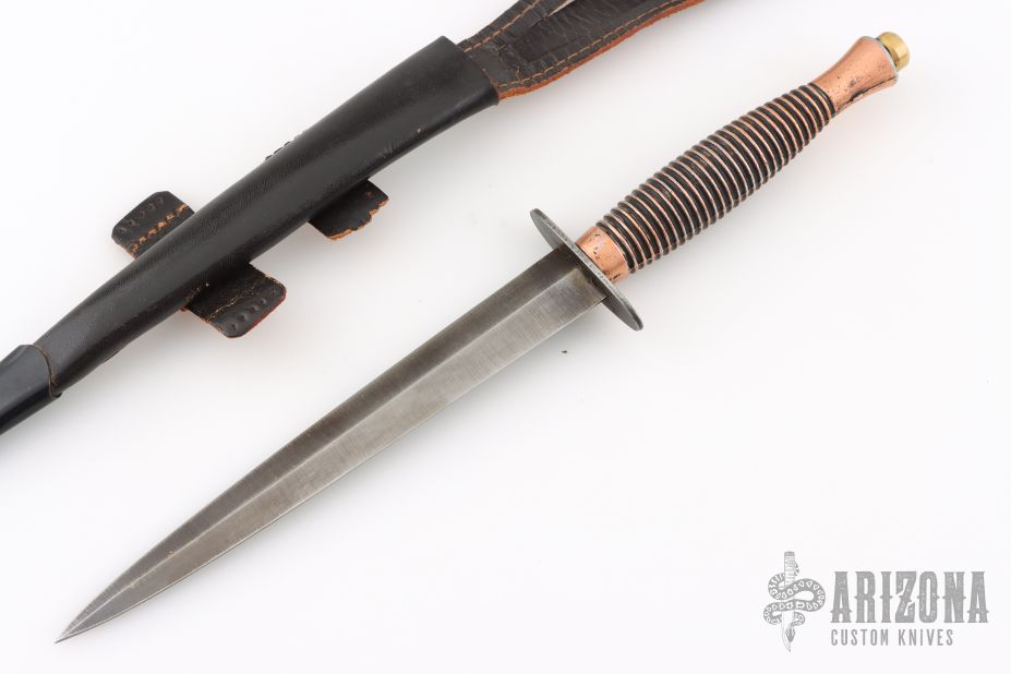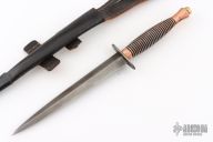 This Fairbairn Sykes is stamped "Sheffield England" on the guard. It features a double-edged blued blade, .197" blade stock and .923" blade depth, hidden tang construction. The handle has a black steel guard and a copper plated (or colored) ribbed handle. Comes with a black leather sheath. Has some scratches and wear, great condition otherwise.