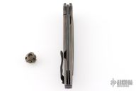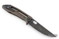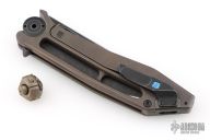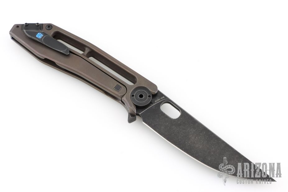 The Kadat is a very limited CKF folder with 4.3" of cutting edge to tackle everyday tasks. This knife has a bronzed titanium frame lock handle with a carbon fiber inlay and sizable cutouts that offer drastic weight reduction. Its blade is made from black stonewashed Bohler M390 steel with a full-flat grind for easy slicing. Despite its size, the Kadat is easy to maneuver and feels lightweight in the hand. Includes a machined titanium pocket clip with a square timascus accent. Features: Ceramic ball bearing pivot allows effortless blade deployment. Sculpted pockets and cutouts in the handle offer reduced weight for comfortable carry. Dual lanyard holes in the backspacer provide options for lanyard and accessory attachment. #175. Excellent Condition.