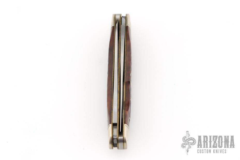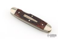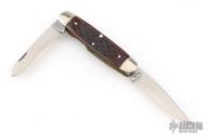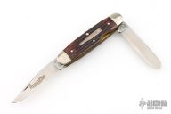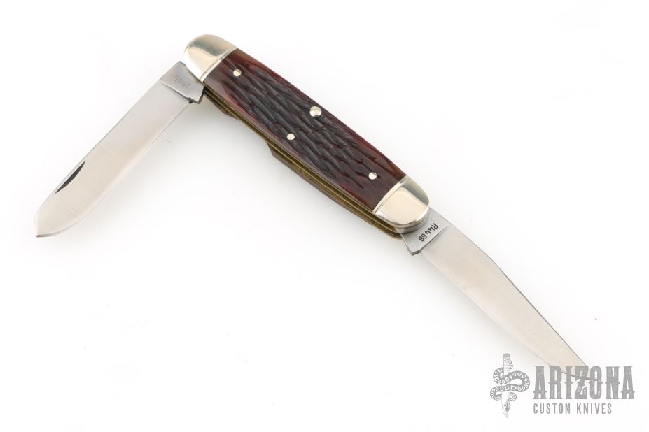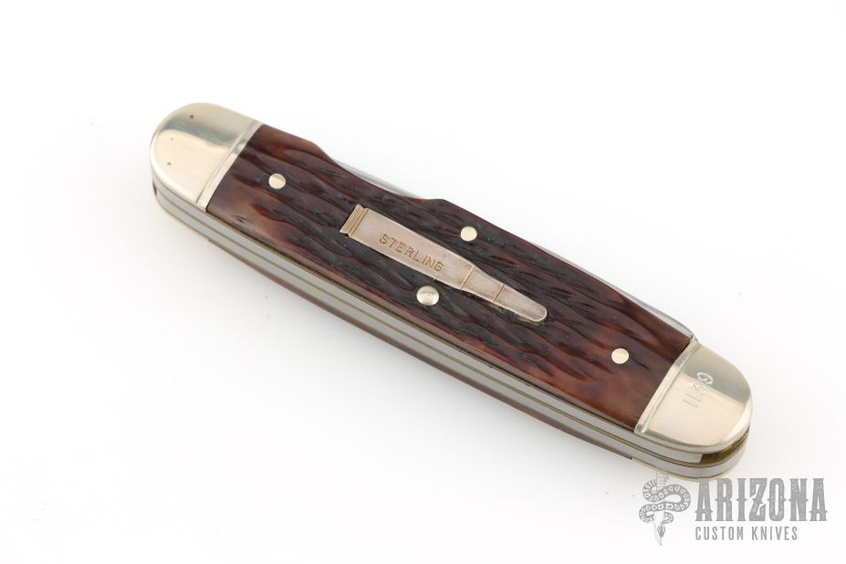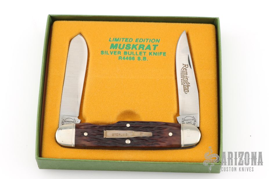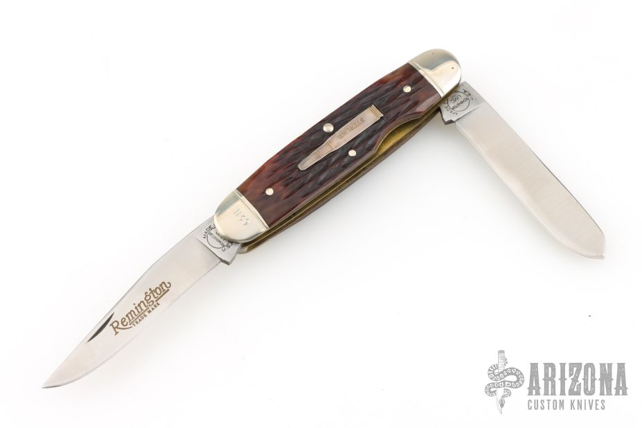 This Knife by Remmington has two satin finished blades with nail nicks. The handle has nickel silver bolsters, jigged bone covers with a sterling silver bullet escutcheon, brass liners and steel springs.  Comes with original box and papers. Excellent condition. Dated 1988 and #1139 of 5000