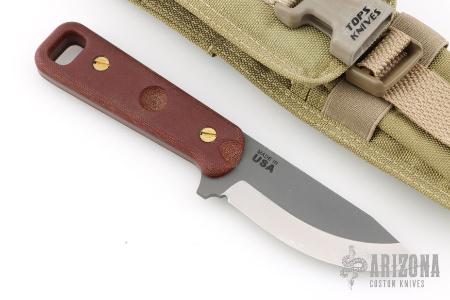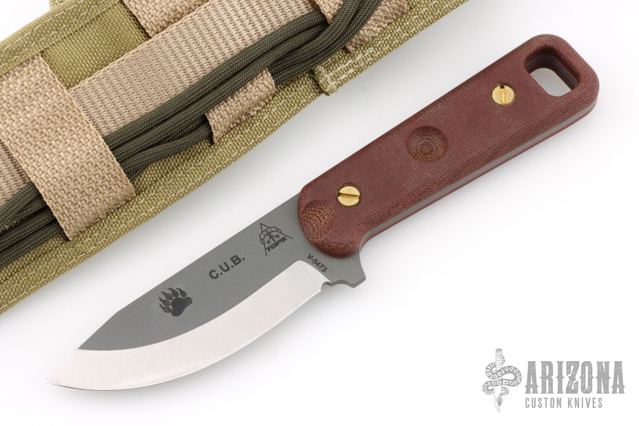 The C.U.B. (Compact Utility Blade) was designed to be a compact, lightweight sidekick to a machete/bolo/parang in the jungle or a tomahawk/ax in North America, capable of performing all the important utility duties of camp craft and food preparation, while leaving the heavy work for the chopping tools. With an emphasis on compact, keeping the total blade length under 4" makes it legal in most states and countries. I designed the C.U.B. with two of my favorite styles of knives in mind, a Finish Puukko (with a Scandinavian grind) and Kephart style knife. Put them in a blender and you have the TOPS C.U.B. - rugged simplicity!