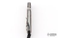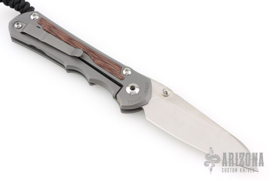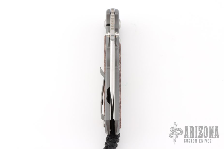 This large Inkosi features a tumble finish blade and a glass blasted titanium and micarta inlays. Bead blast titanium clip, tip up carry. Has dual thumbstuds and barrel spacer. Includes original packaging and maker's card dated January 11, 2024.  Excellent condition.