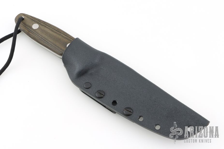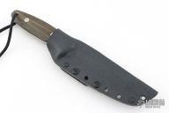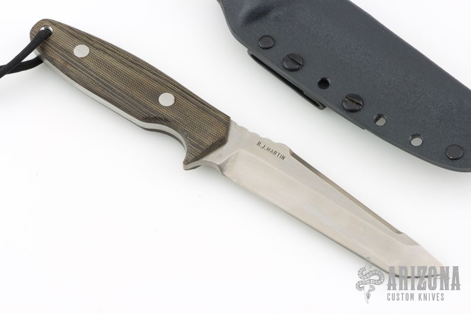 This knife by RJ Martin features a chisel ground satin finished tanto blade with a notched thumbrest and false top edge, .198" blade stock and 1.169" blade depth, full tang construction. The handle has black/green canvas micarta scales. Comes with a kydex sheath and zipper case. Has a few light scratches, great condition otherwise.