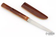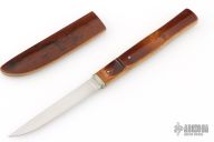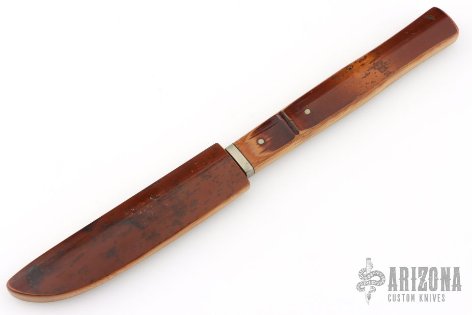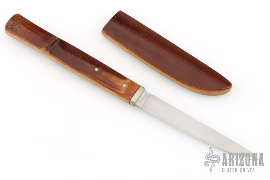 This knife features a hand rub satin finished drop point blade, with a hidden tang construction, .120" blade stock, .585" blade depth.  The handle is constructed of pinned bamboo and a nickel silver ferrule.  Comes with matching bamboo saya, and a zipper case. Has a light patina. Great condition.