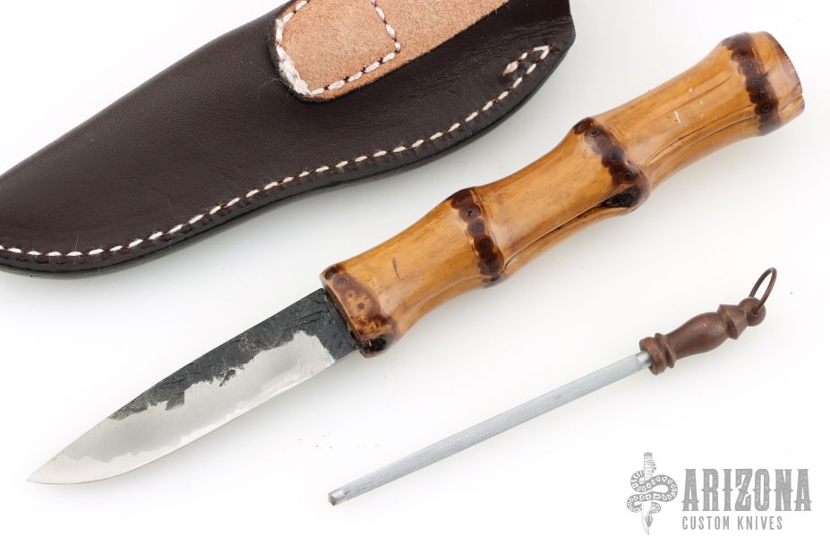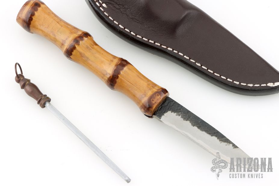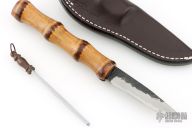 This knife features a drop point San Mai blade with a hidden tang construction, .123" blade stock, .705" blade depth.  The handle is constructed of bamboo. Very sharp edge. Comes with a brown leather sheath and original box. Has some light scratches, otherwise Excellent Condition.  Made in Japan.