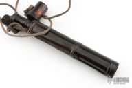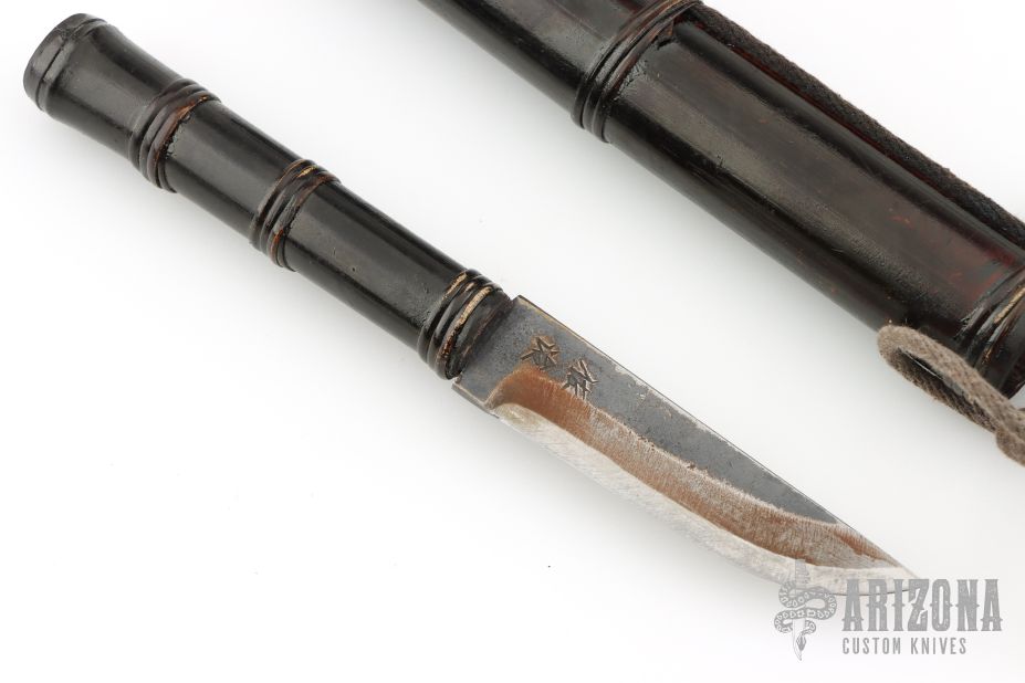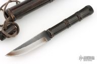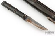 This knife features a drop point San Mai blade with a hidden tang construction, .149" blade stock, .882" blade depth.  The handle is constructed of bamboo. Very sharp edge. Comes with a matching bamboo tube sheath and original box. Has some light scratches and some oxidation, otherwise Excellent Condition.  Made in Japan.