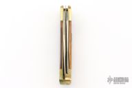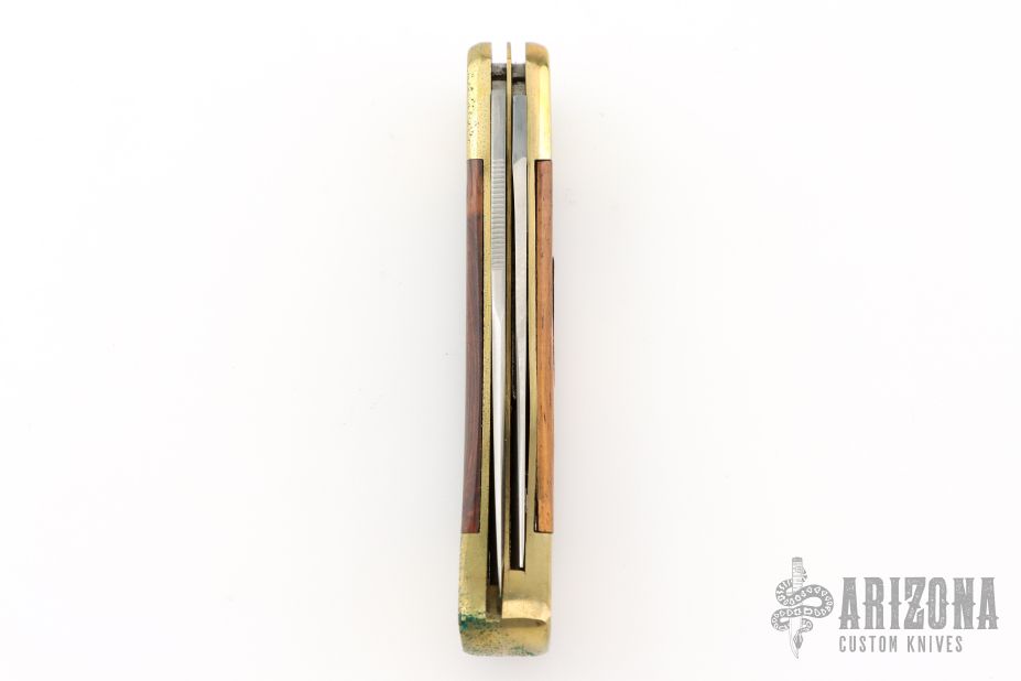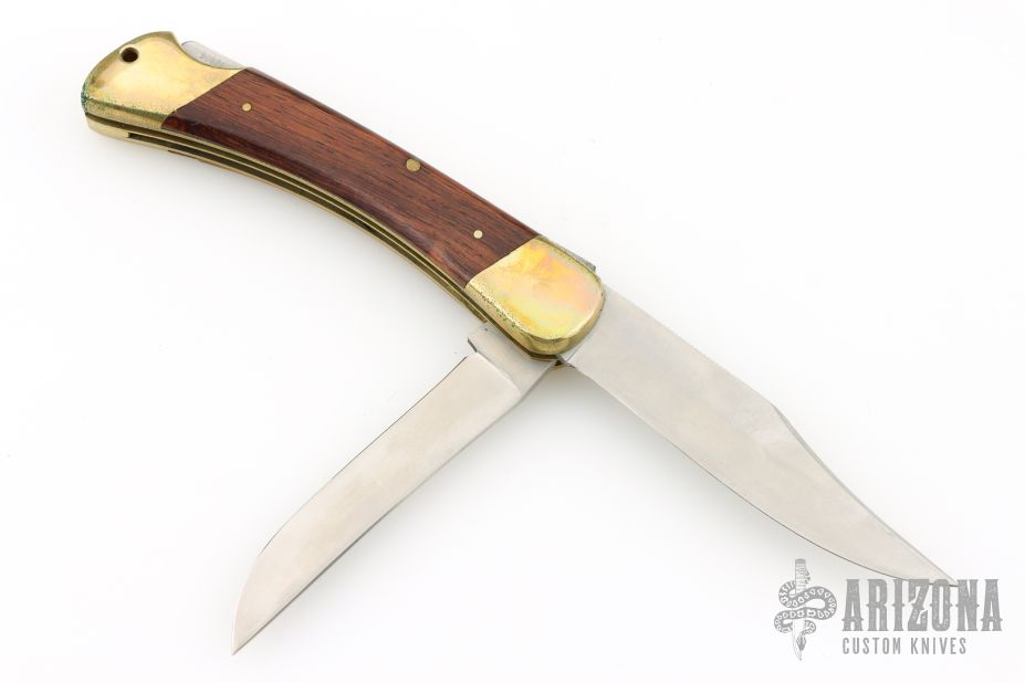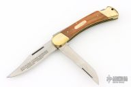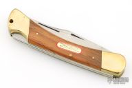 This Puma Game Warden lockback has a brass frame with wood scales. The blades are satin finished with nail nicks. Has some light scratches and some spots where the foam has pitted the brass, otherwise excellent condition.  Comes with original box and papers. #90174