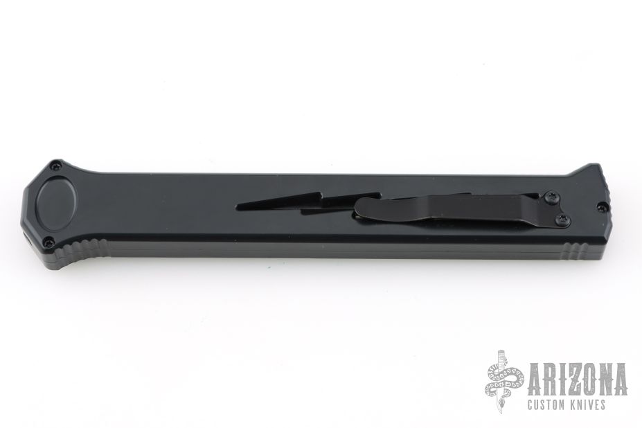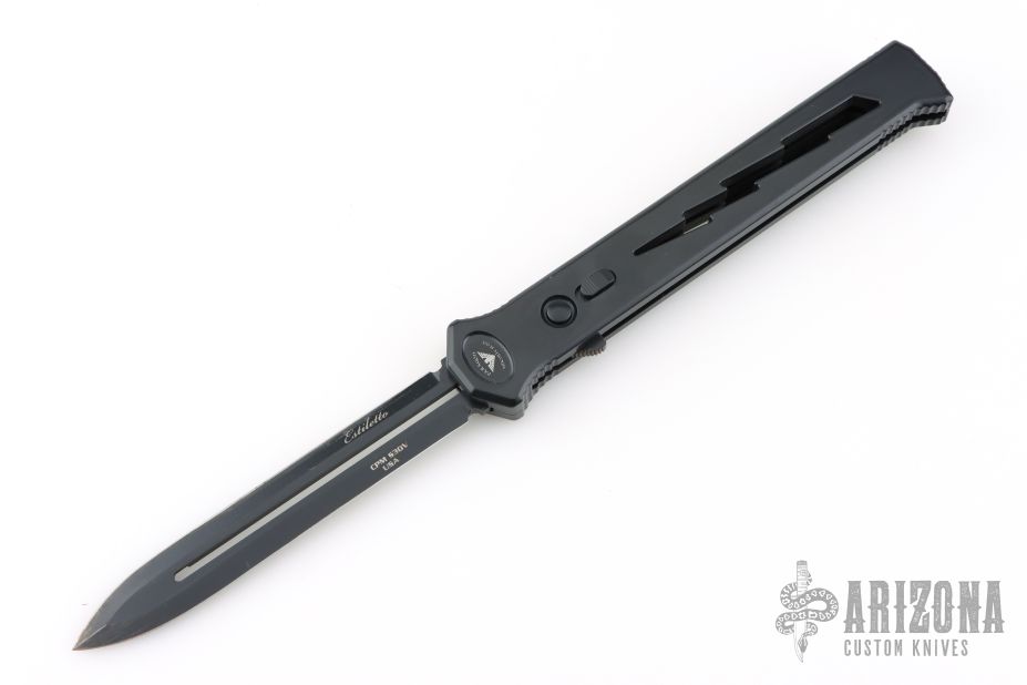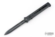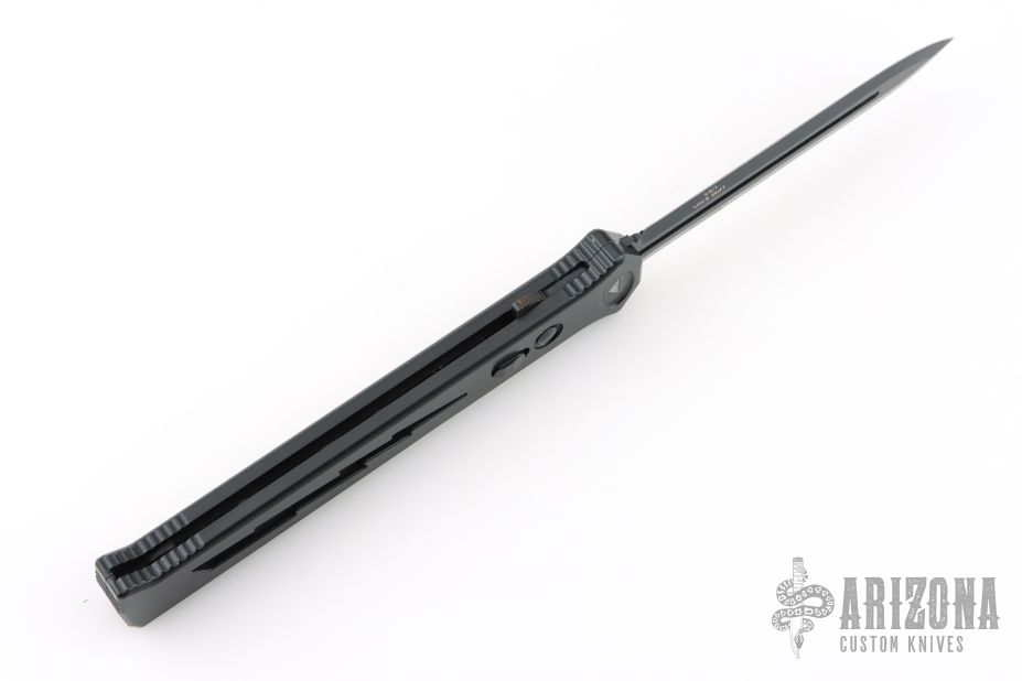 Joining the Estiletto OTF lineup is this fantastic model with a USA cutout on the black anodized aluminum body with black hardware/clip and a black coated dagger blade with plain cutting edges.