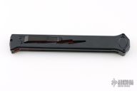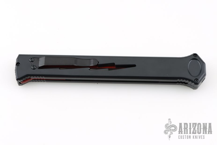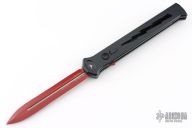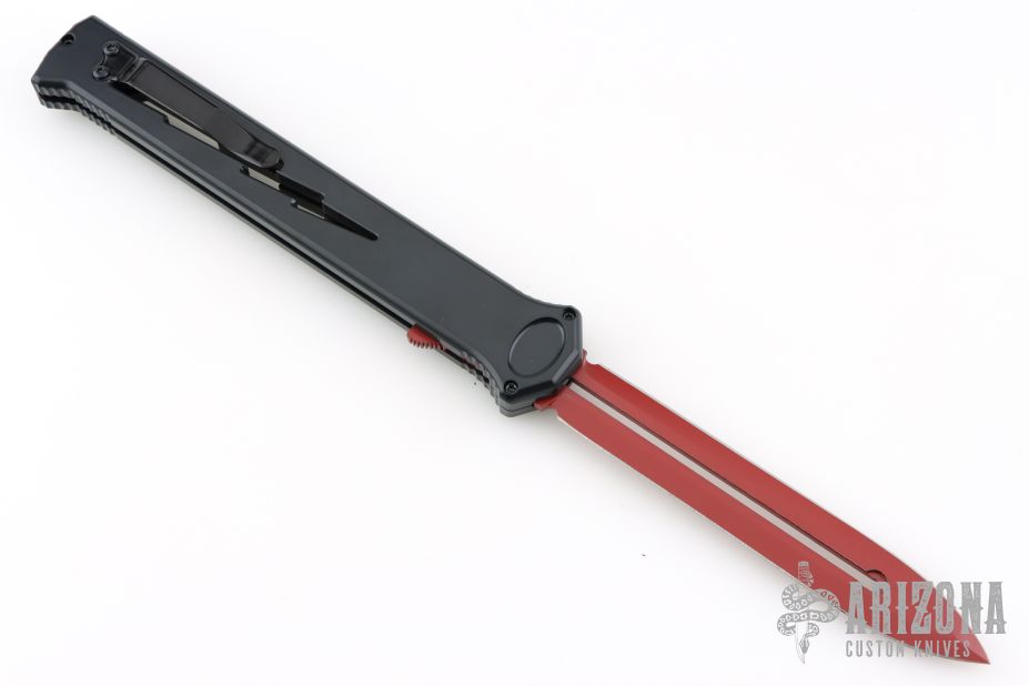 Joining the Estiletto OTF lineup is this fantastic model with a USA cutout on the black anodized aluminum body with black hardware/clip and a red coated dagger blade with plain cutting edges.