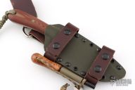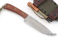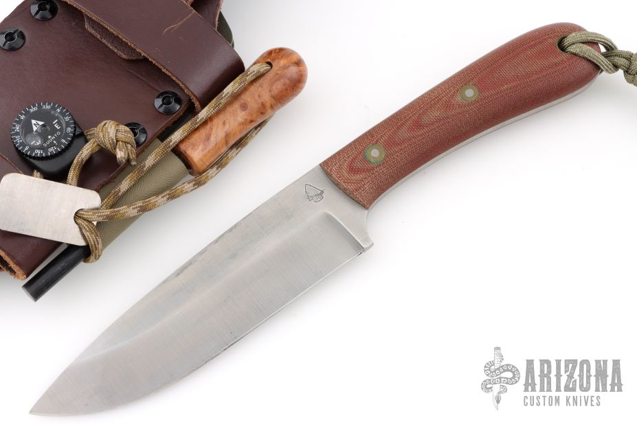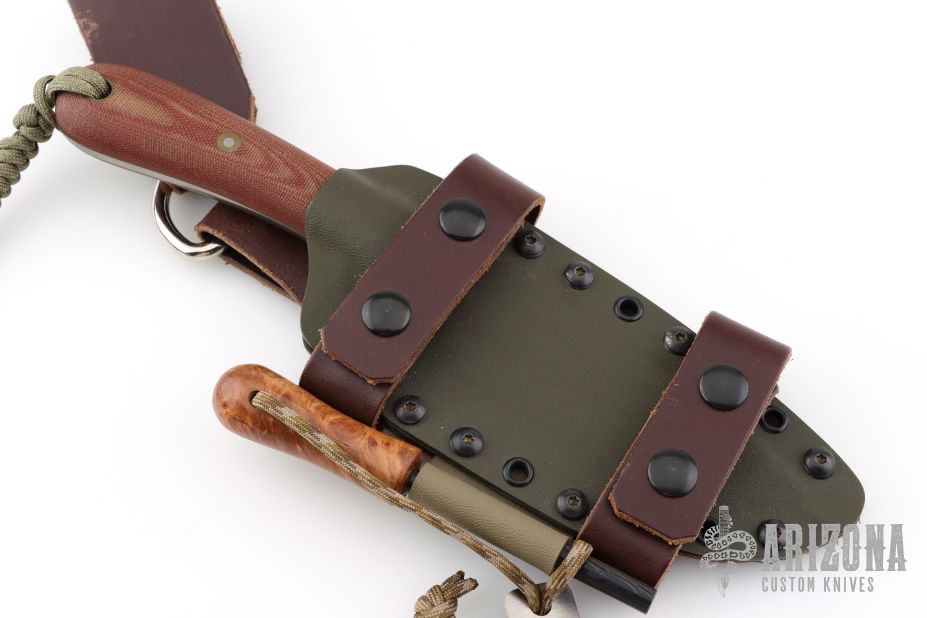 This knife by Battle Horse Knives features a drop point blade with a full tang construction.  .156" Blade Stock.  1.625" Blade Depth.  The handle has micarta scales. Includes a Kydex sheath.  Has a few light scratches otherwise the knife is in excellent condition.