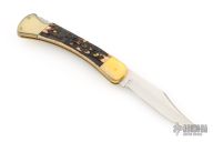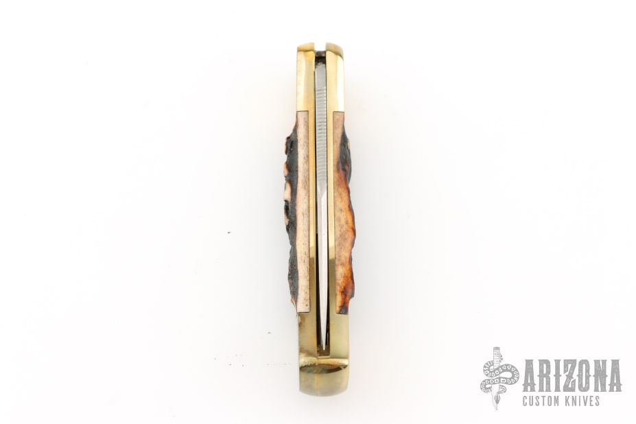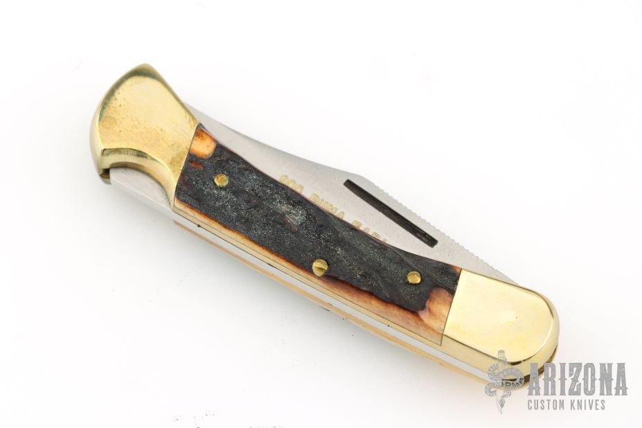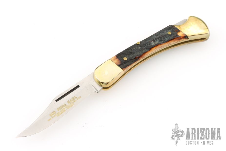This Vintage German-made lockback by Puma has brass bolsters with integral liners. Very nice stag scales. Blade is satin finished with nail nick and notched thumbrest. Comes with original box and papers. Excellent condition. #77473