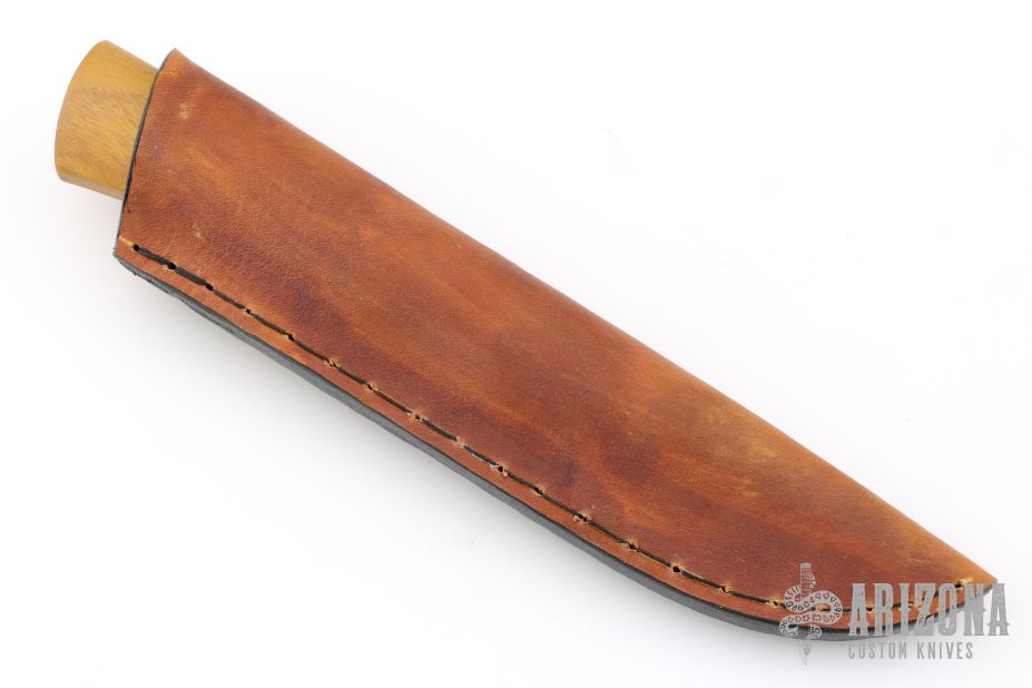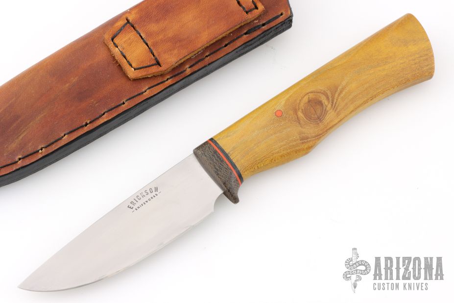 This Hunter by Robert Erickson features a satin finished blade with a hidden tang construction, .065" Blade Stock, 1.051" Blade Depth.  The handle has a micarta guard and an Osage orange wood grip.  Includes a brown leather sheath with a COA.  Has a few light sheathing marks otherwise the knife is in Excellent Condition.