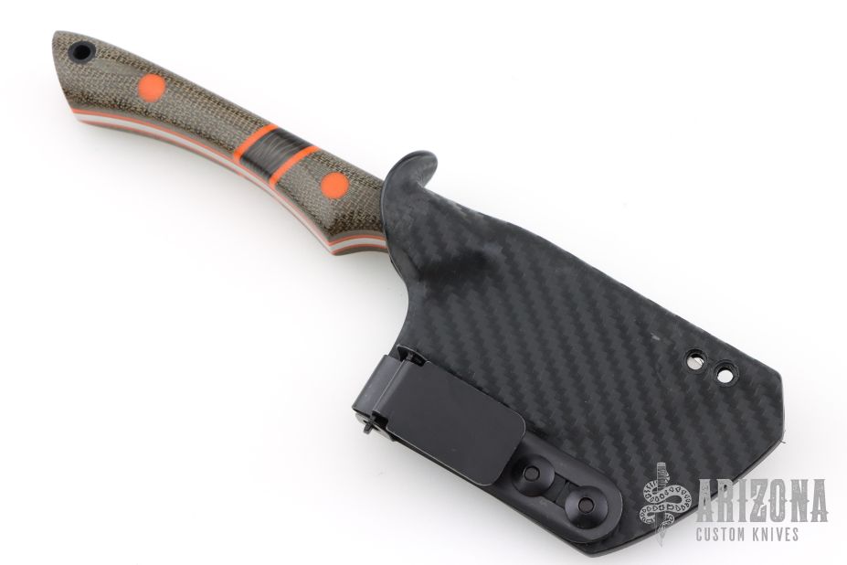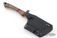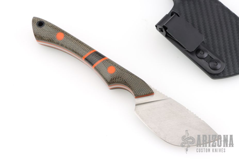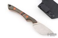 This knife by Matt Gentry features a satin finished drop point blade with a notched thumbrest and a full tang construction. .179" Blade Stock. 1.18" Blade Depth. The handle has G10 scales. Includes a Kydex sheath. Excellent Condition.