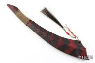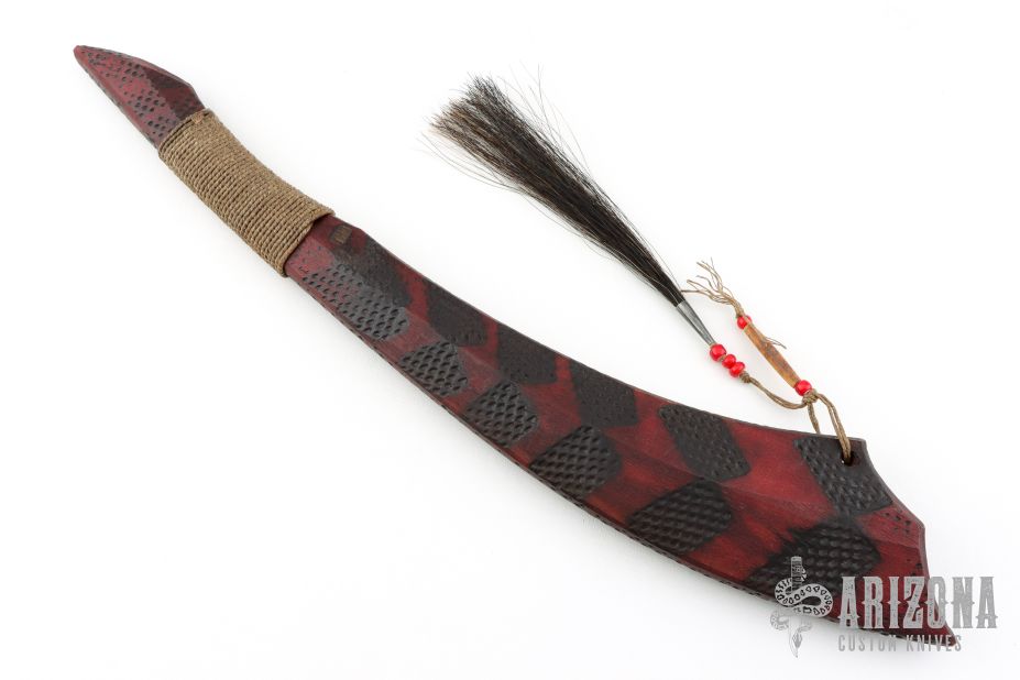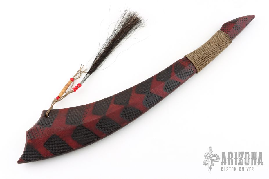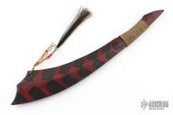 Straight from Ryan's shop is his take on the Red Stick war club! Inspired by the Creek warriors. Ryan took the theme and ran with it! His Red Stick Club is constructed from straight-grained hard wood with fire branded dimples down the length of it. The main body features a long sweeping profile with a cord wrapped handle and features a feather and ornate beads. These Red Stick War Club Saps are not for the faint of heart!
