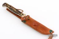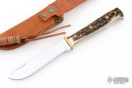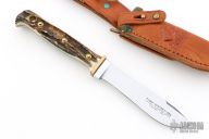 This Hunter's Pal by Puma Knives features a satin finished blade with notched spine and false top edge, .168" blade stock and .825" blade depth, full tang construction. The handle has a brass guard with stag scales. Includes original box, papers and leather sheath. #96583 on the guard. Excellent condition.