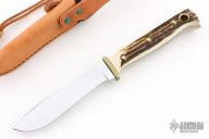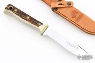 This Hunter's Pal by Puma Knives features a satin finished blade with notched spine and false top edge, .168" blade stock and .825" blade depth, full tang construction. The handle has a brass guard with stag scales. Includes original box, papers and leather sheath. #22072on the guard. Excellent condition.