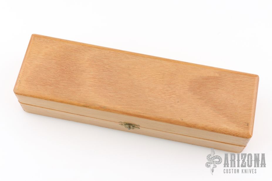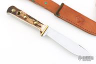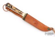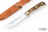 This "Hunter's Friend" by Puma features a satin finished blade with single sided fuller and swedge near tip, notched thumbrest, .190" blade stock and 1.030" blade depth, full tang construction. The handle has stag scales with brass rivets and a brass guard. This piece is in Excellent condition. Comes with original brown leather sheath with belt loop, box and papers. #56984