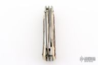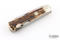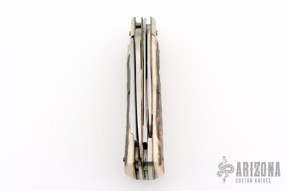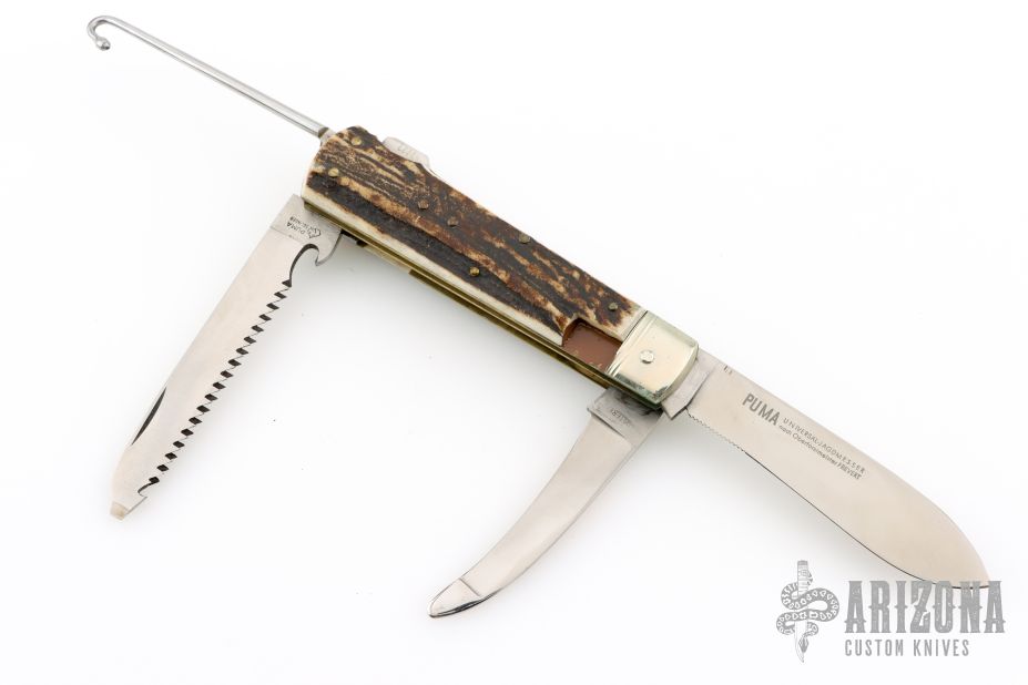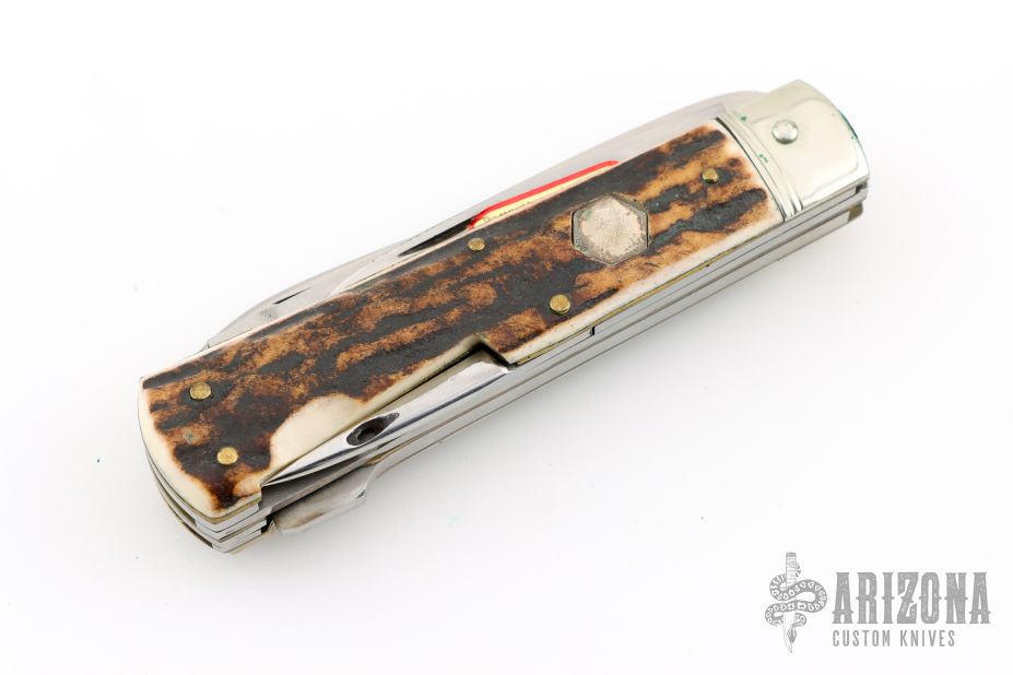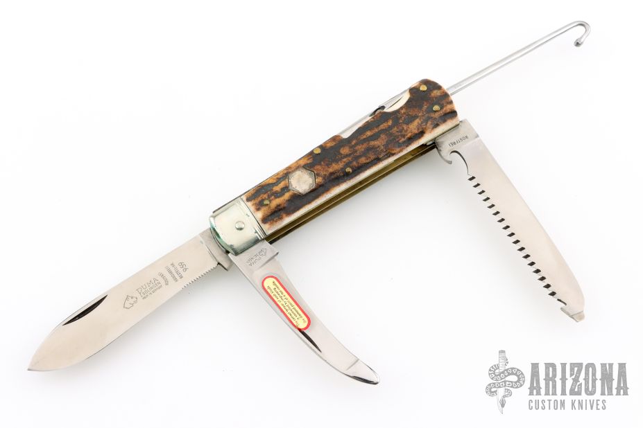 This legendary knife features satin finished stainless steel (Rostfrei) blades. The handle has nickel silver bolsters, stag scales, brass liners and stainless steel springs. Has brass hexagon inlay stamped "008" or "800" not sure which is correct. Main blade is a lockback, lock tab is stamped "62273". Has a drop point blade, a hawkbill blade with rounded tip, saw blade with bottle opener, carry hook, and leather punch. Excellent condition. Comes with original box, sheath and papers.