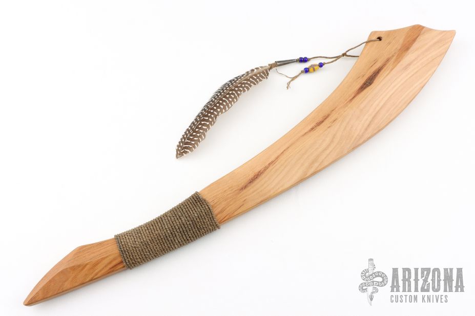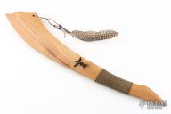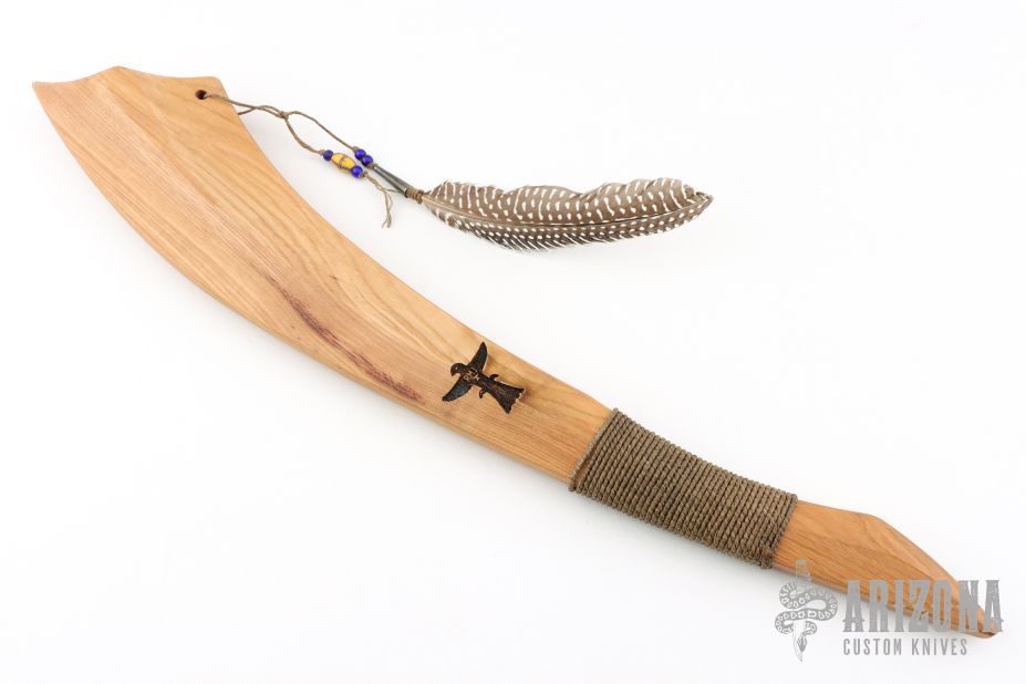 Straight from Ryan's shop is his take on the Red Stick war club! Inspired by the Creek warriors. Ryan took the theme and ran with it! His Red Stick Club is constructed from straight-grained hard wood with the Thunderbird motif down the length of it. The main body features a long sweeping profile with a cord wrapped handle and features a feather and ornate beads. These Red Stick War Club Saps are not for the faint of heart!