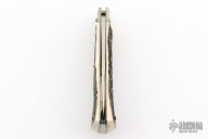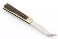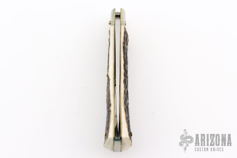 This legendary knife features a partially serrated satin finished stainless steel (Rostfrei) blade. The handle has nickel silver bolsters, stag scales, brass liners and stainless steel springs. Lock tab is stamped "83274". Comes with original box, sheath and papers. Excellent condition.