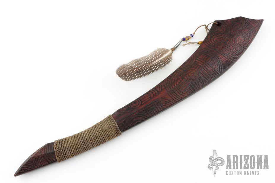 Straight from Ryan's shop is his take on the Red Stick war club! Inspired by the Creek warriors. Ryan took the theme and ran with it! His Red Stick Club is constructed from straight-grained hard wood with pottery stamps down the length of it. The main body features a long sweeping profile with a cord wrapped handle and features a feather and ornate beads. These Red Stick War Club Saps are not for the faint of heart!