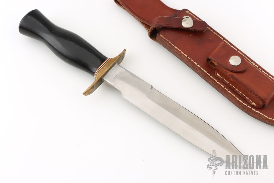 This Solingen Fighter by Randall Made Knives features a satin finished blade with sharpened top edge, .200" blade stock and 1.265" blade depth, hidden tang construction. The handle has a brass double guard, black linen micarta grip with red/white/blue spacers. Comes with a brown leather sheath. Has a couple light scratches, otherwise excellent condition. Stamped "W. Germany", but some of it has worn off in the finishing process. Vietnam Era