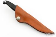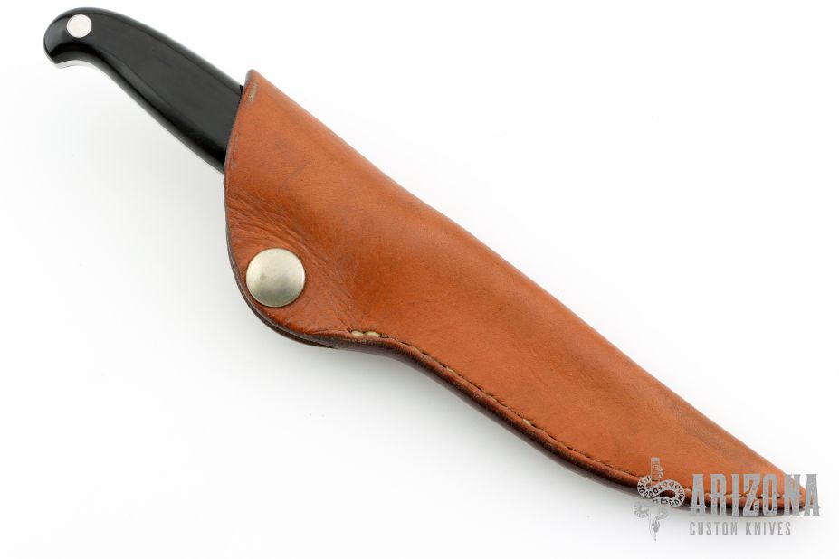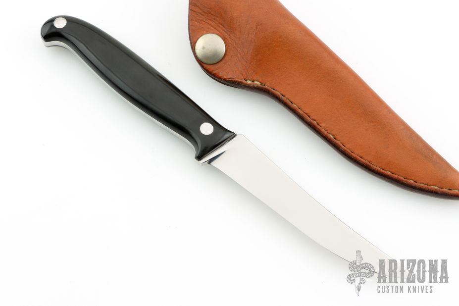 This knife by Harry Mitchell features a mirror polished blade with .174" blade stock and .829" blade depth, full tang construction. The handle has pinned black paper micarta scales. Comes with a brown leather sheath. Has a couple light scratches, excellent condition.