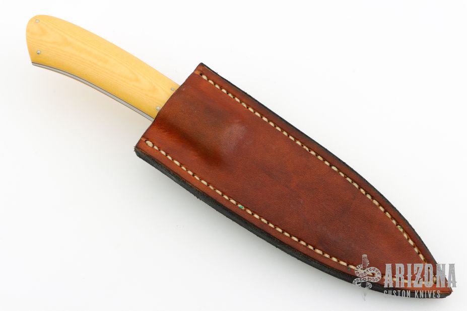 This knife by Mike Zscherny features a hand rub satin finished blade with top edge, .191" blade stock and .858" blade depth, tapered tang construction. The handle has engraved steel dovetail bolsters, pinned micarta scales with red liners. Includes leather sheath with metal clip. Excellent condition.
