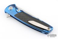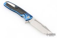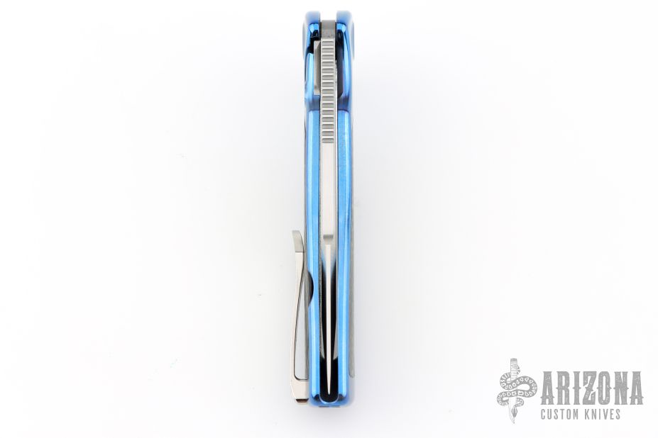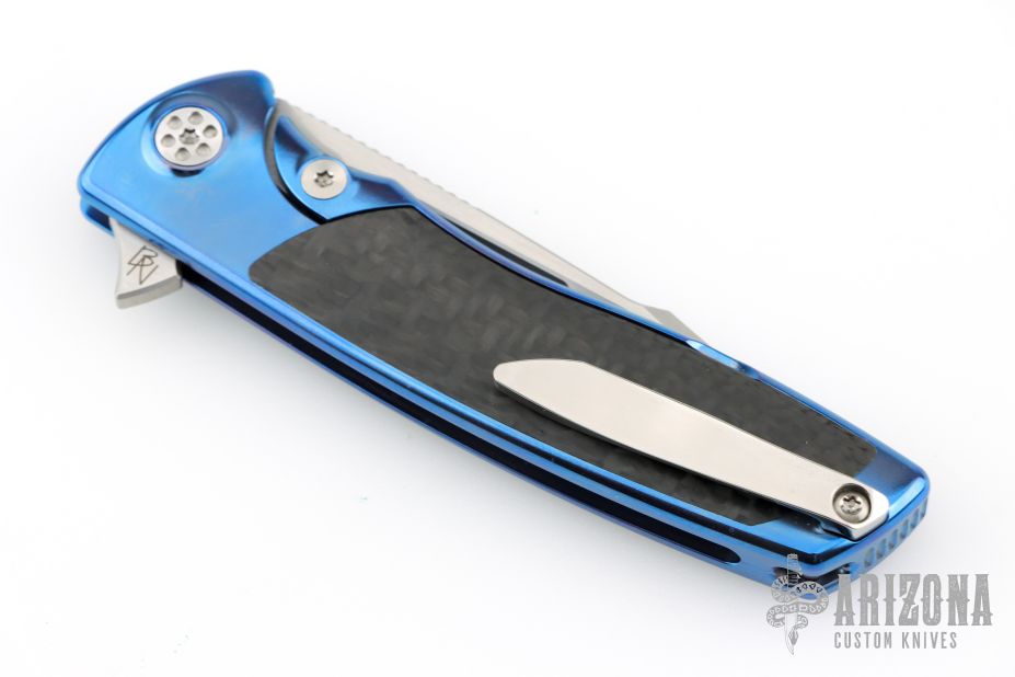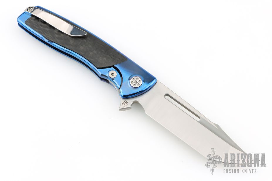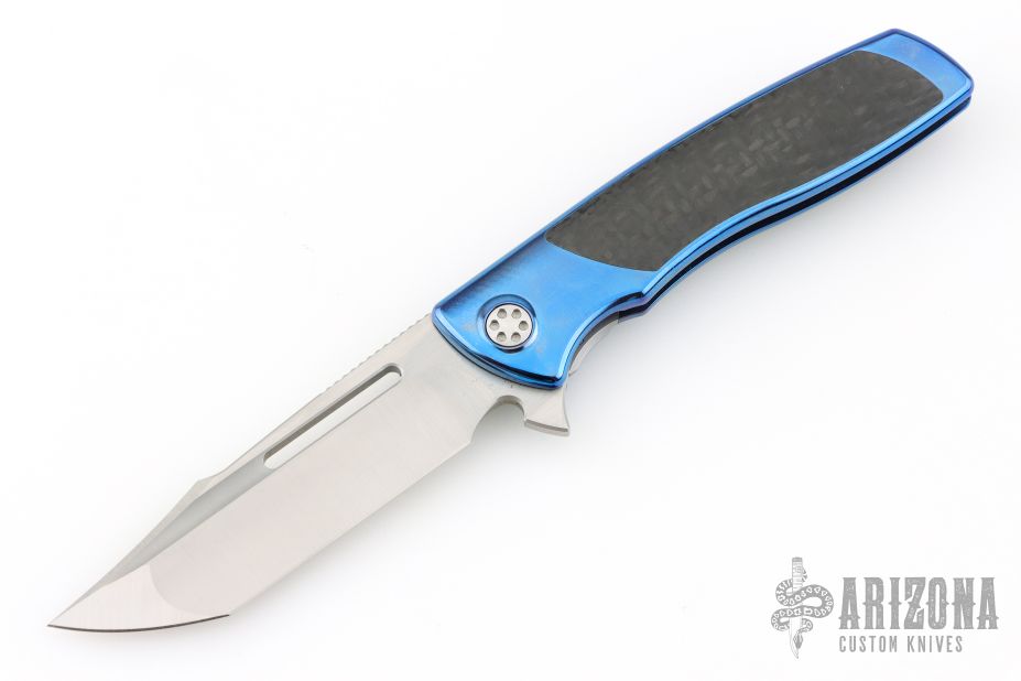 This Mini Evo from Brian Nadeau features a satin finished Harpoon blade with a fuller and notched thumbrest. The handle has an anodized titanium frame with carbon fiber inlays, satin titanium tip up clip. Rides on bearings, nice detent, lockup and blade seating, stainless lockface insert. Includes original box. Excellent condition.