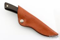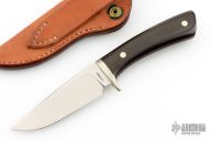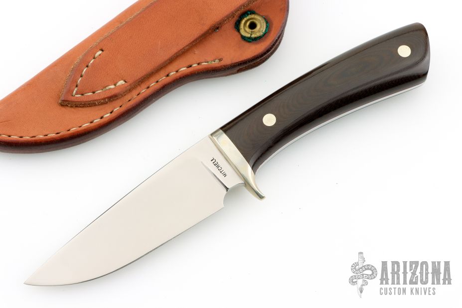 This hunter by Harry Mitchell features a mirror polished blade with .198" blade stock and 1.31" blade depth, full tapered tang construction. The handle has a nickel silver guard with micarta scales. Comes with a brown leather sheath. Excellent condition.