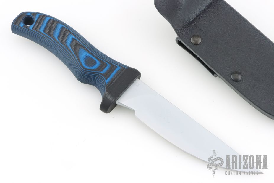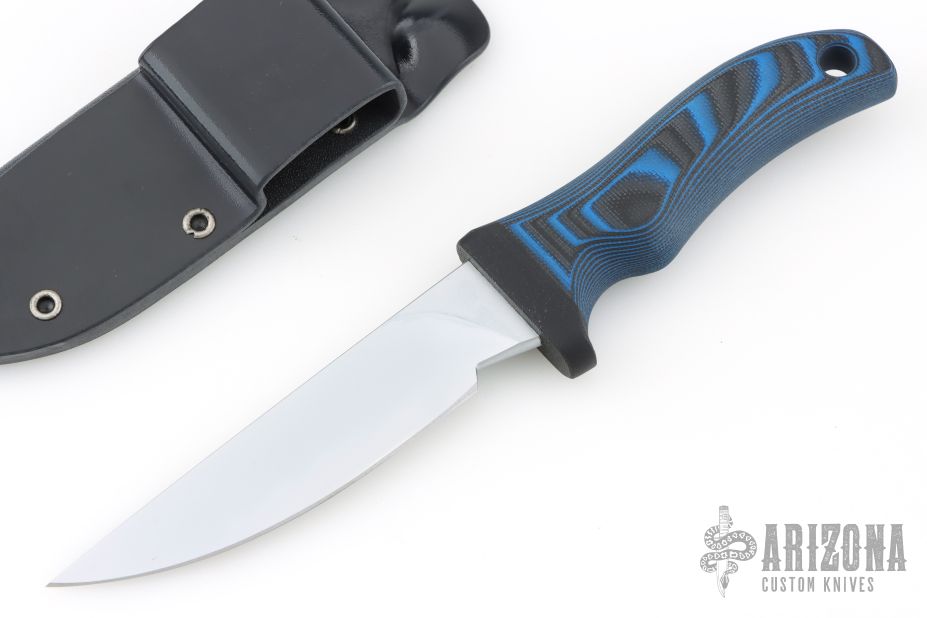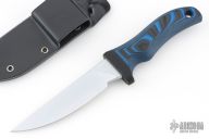 This Springbok by MadDog Knives features hard chrome blade with .189" stock and .995" blade depth, hidden tang construction. Black & Blue composite handle -- compression bonded to the hidden full tang and incredibly ergonomic. It is hard and tough enough to be used as an impact tool. Includes a high rider kydex sheath and a padded zippered case. New From Maker!