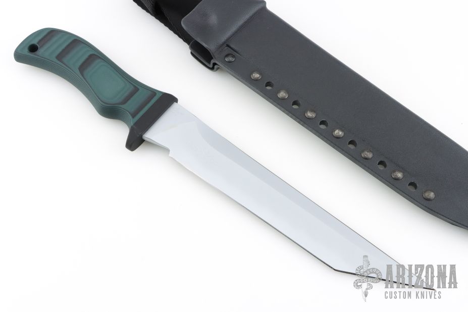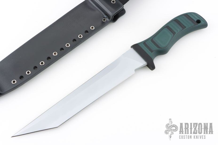 This Sutabi by Mad Dog Knives features tanto style blade with a sharpened top edge .201" stock, and 1.457" blade depth, hidden tang construction.  Hard chrome blade finish. The handle is designed to be ergonomic and has the ability to withstand tremendous punishment with little or no damage. It is hard and tough enough to be used as an impact tool. Black composite handle -- compression bonded to the hidden full tang and incredibly ergonomic. The knife comes with a kydex belt sheath. New from Maker!